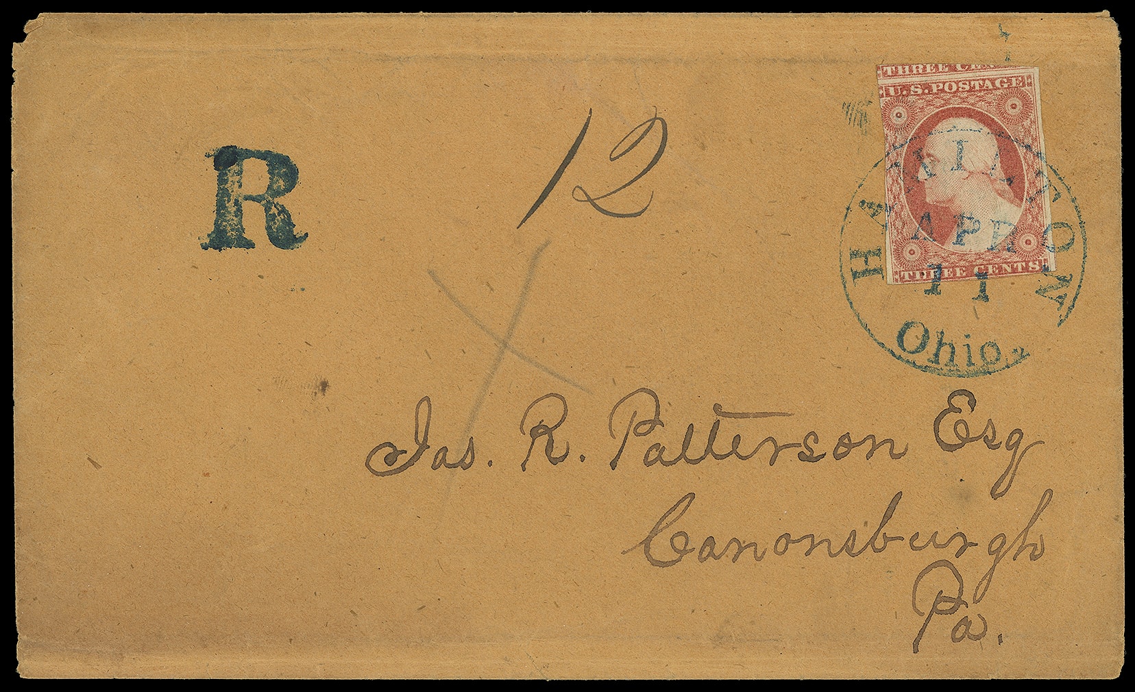 350     R-HM-1 imageHamilton, Ohio "R". Bold blue strike with ms. "12" registry number, matching "Hamilton, Ohio. Apr 11" cds ties 3¢ dull red (11A), huge margins to in, on orange cover to Canonsburgh Pa., additional pencil "X"; some edge wear, Very Fine.