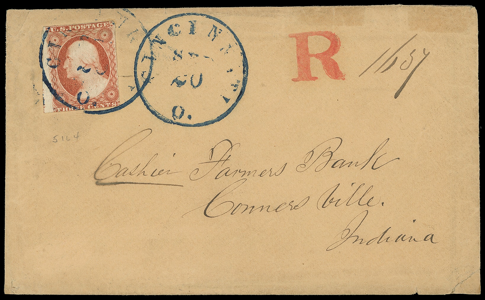 344     R-CL-1 imageCincinnati O. "R". Perfect red handstamp with ms. "1657" registry number on buff cover bearing 3¢ dull red (11) left sheet margin single, pos. 51L4, tied by blue "Cincinnati O. Sep 20" cds, second strike adjacent to Connersville Ind., original 1855 letter indicating $106.98 note enclosed; some wear and small corner tears, Very Fine and striking early registered use.