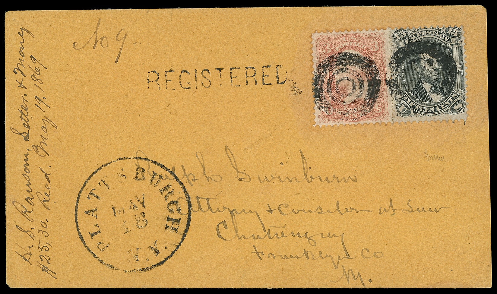 341     R-PT-1 imagePlattsburgh N.Y. "Registered". Straightline with ms. "No 9" registry number, matching "Plattsburgh N.Y. May 18" cds and target cancels tie 3¢ rose red, F. grill (94) and 15¢ black, F grill (98) on orange cover to Chateaugay N.Y., 1869 docketing at left, Very Fine.