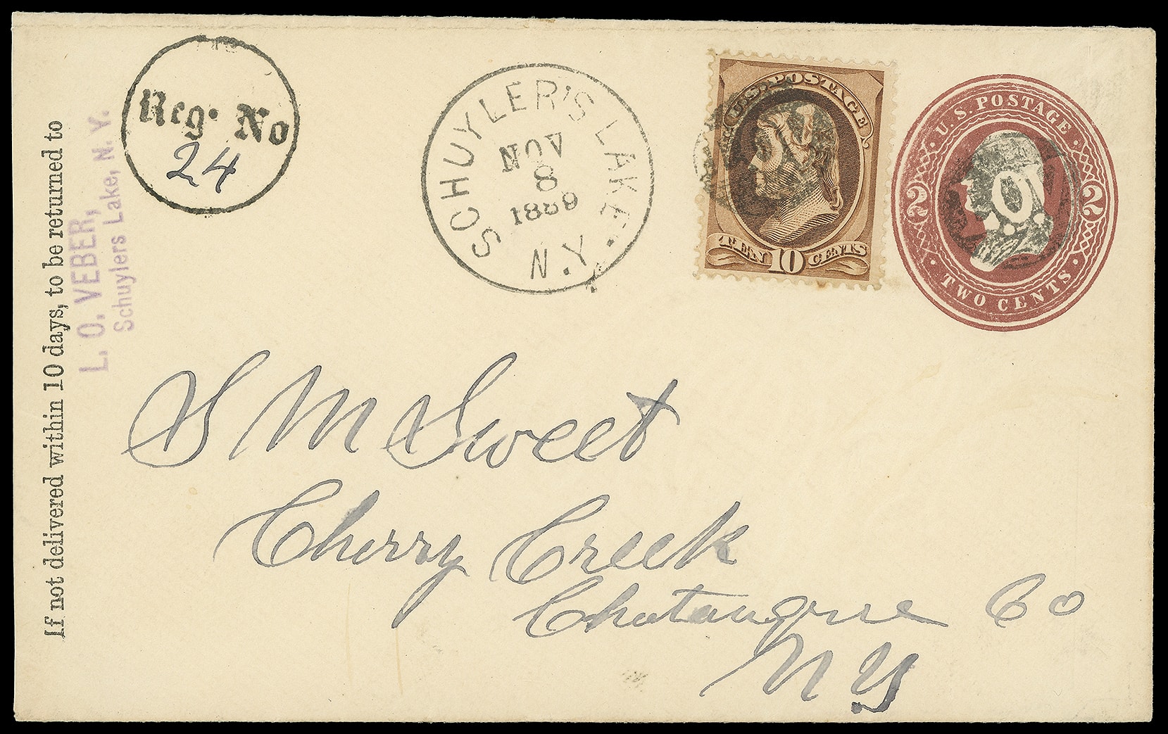 342       imageSchuyler's Lake N.Y., Nov 8, 1889. Cds and bold "Reg. No 24" circular handstamp on 2¢ red brown entire bearing 10¢ brown (209) tied by negative "L.O.V." oval fancy cancel to Cherry Creek N.Y.; reduced at left, Very Fine.