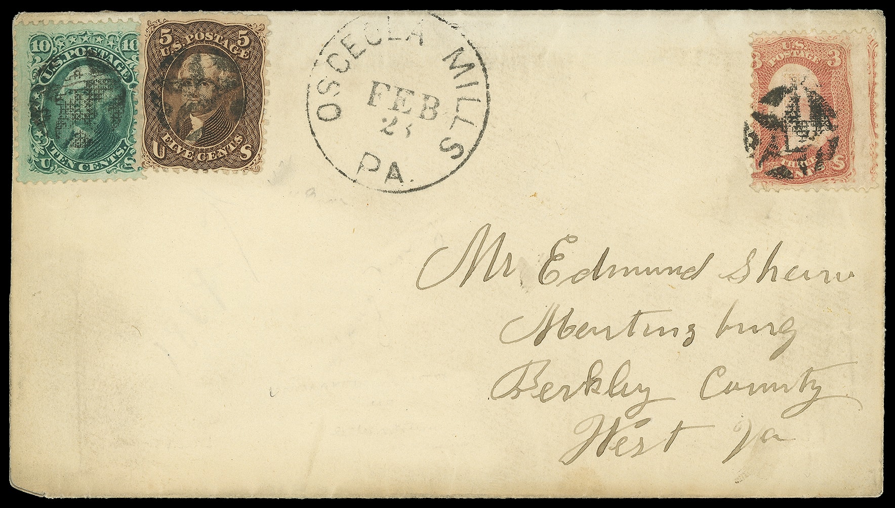 355       imageOsceola Mills Pa. Feb 23. Cds with matching fancy star cancels tie 5¢ brown (76), 3¢ red, F grill (94), 10¢ green, E grill (89), on registered cover to Martinsburg W.V., flap with remnant of registry return receipt, 1869 letter indicates $10 enclosed; some light soiling and edge wear, F.-V.F. and attractive fancy cancel use.