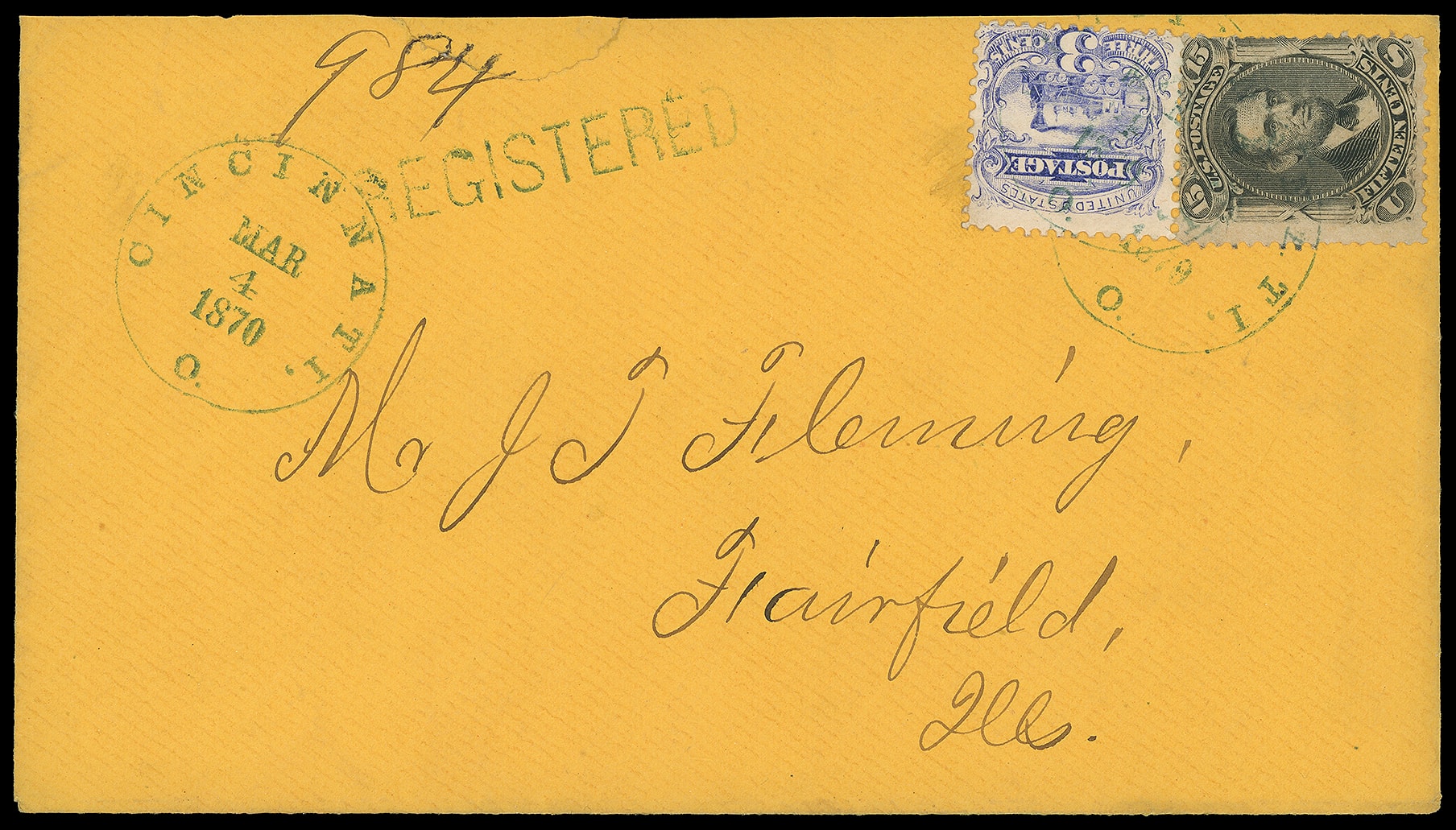 345     R-Cl-3 imageCincinnati O. "Registered". Blue straightline with ms. "784" number, matching "Cincinnati O. Mar 4, 1870" cds adjacent and second strike tying 1868, 15¢ black, F grill (98) and 1869, 3¢ ultramarine (114) to Fairfield Ill.; small top edge mend and flap missing, otherwise fresh and Very Fine, only recorded example.