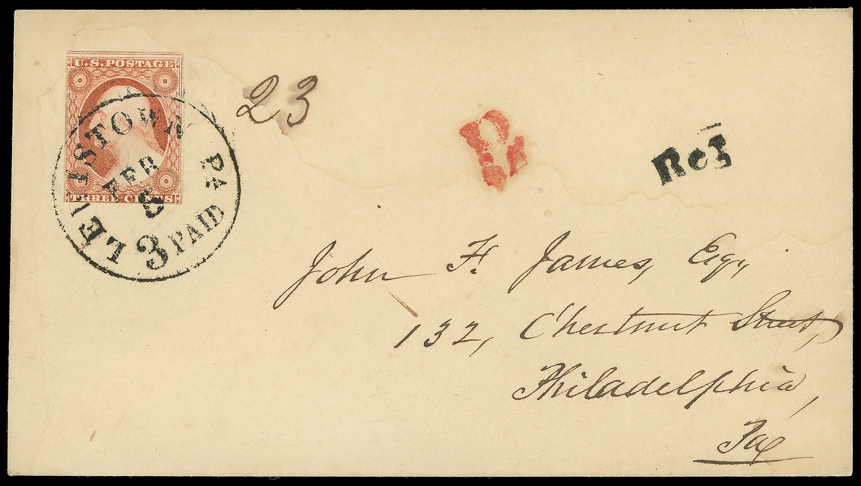 353     R-LW-2 imageLewistown Pa. "Reg". 5 x 13mm handstamp and ms. "23" number, matching "Lewistown Pa. '3 Paid' Feb 5" intregral-rate cds ties 3¢ dull red (11A) margins to in, on amber cover to Philadelphia Pa., red "R" registry handstamp, Very Fine and rare registered use with two different handstamps.