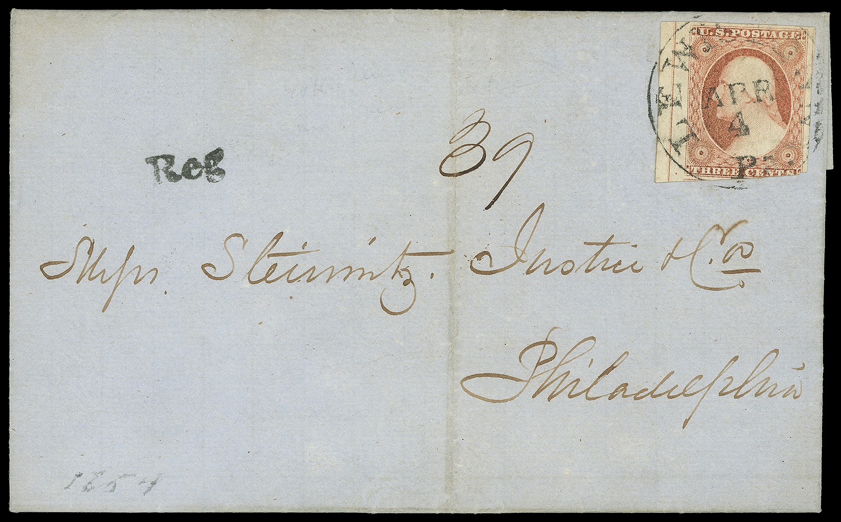 354     R-LW-3 imageLewistown Pa. "Reg". 5 x 13mm handstamp and ms. "39" number, matching "Lewistown Pa. Apr 4" cds ties 3¢ dull red (11A) straddleline single with large margins except in at bottom, on blue 1854 folded letter to Philadelphia Pa.; central file fold, 3¢ small tear, Very Fine strike.