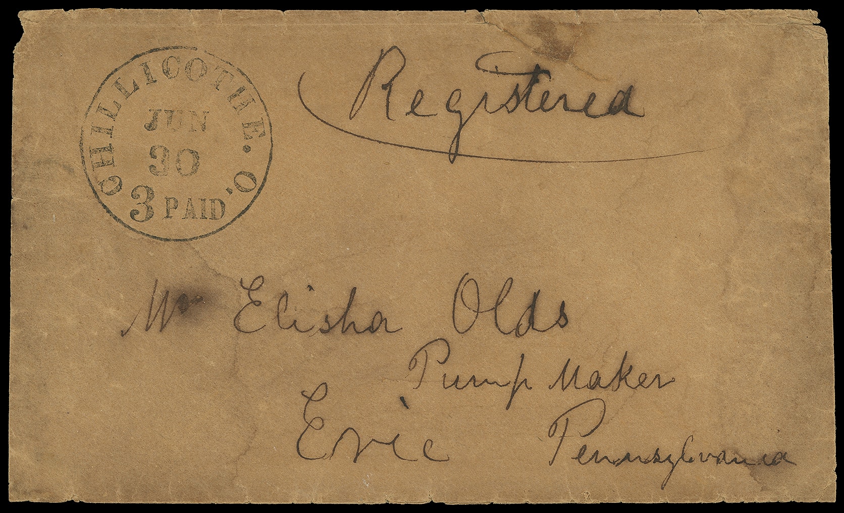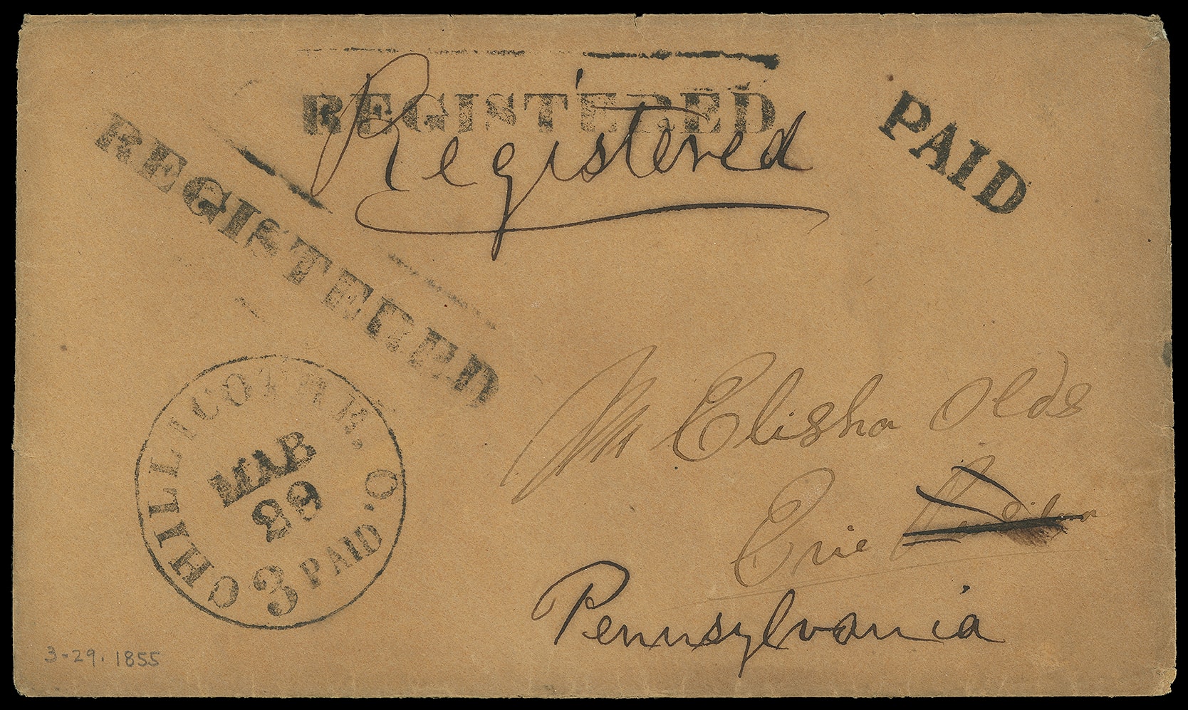 348     R-unlisted imageColumbus, Ohio "Registered". Two 4½ x 56mm transit straightline strikes on buff cover with "Chillicothe, O. '3 Paid' Mar 29" integral-rate cds and matching "Paid" handstamp with ms. "Registered" to Erie Pa.; accompanied by second use without straightline, circa 1855 "Chillicothe, O. '3 Paid' Jun 30" integral-rate cds with ms. "Registered" from same correspondence to Erie Pa., which is the last day of the unofficial registration period; some edge wear, light aging, F.-V.F. and interesting registered exhibit pair.