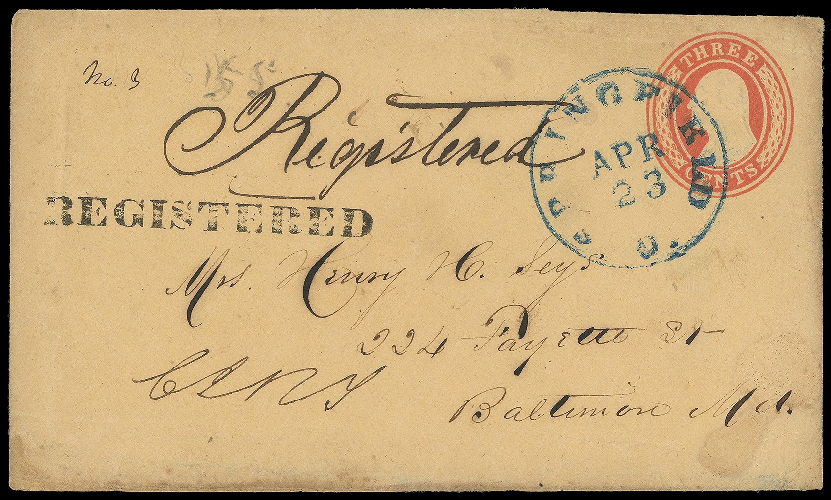 349     R-unlisted imageColumbus, Ohio "Registered". 4½ x 56mm transit straightline on 3¢ red (U10) buff entire canceled by blue "Springfield O. Apr 23" cds with ms. "Registered" rating to Baltimore Md., small ms. "No 3" correspondence number, pencil 1855 dating; accompanied by second use without straightline, blue "Springfield O. Jun 13" cds with matching "Paid" and "Paid 3" in circle ratings with ms. "Registered" to Williamstown Mass., small ms. "No 40" correspondence number, pencil 1855 dating, F.-V.F. pair.