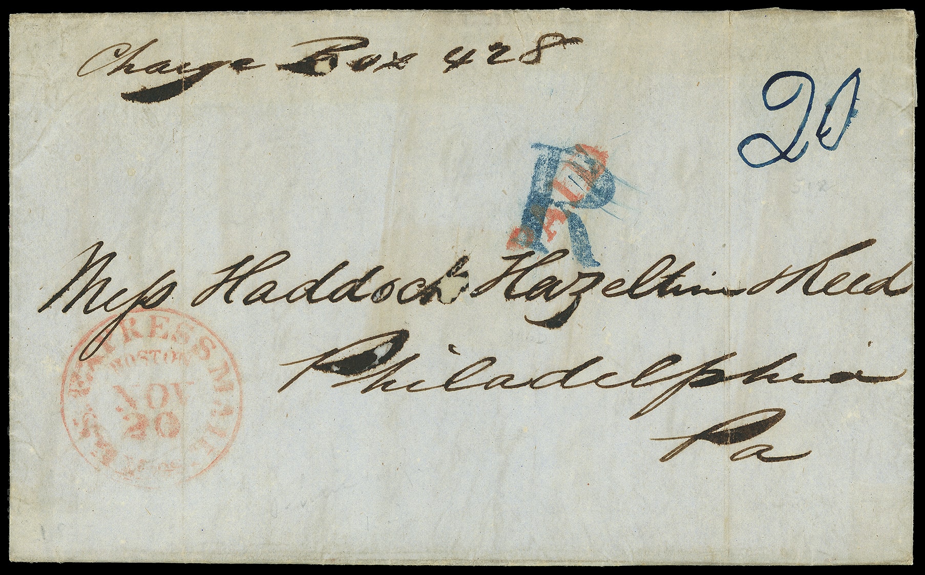 359     R-PH-1 imagePhiladelphia Pa. Large Blue "R". Complete bold strike on gray 1845 folded letter with red "U.S. Express Mail 'Boston, Mass.' Nov 20" railroad route agent cds and matching "Paid" handstamp with ms. "20" rating to Philadelphia Pa., ms. "Charge Box 428" notation; top edge refinforced, Very Fine and early strike, the earliest railroad use.