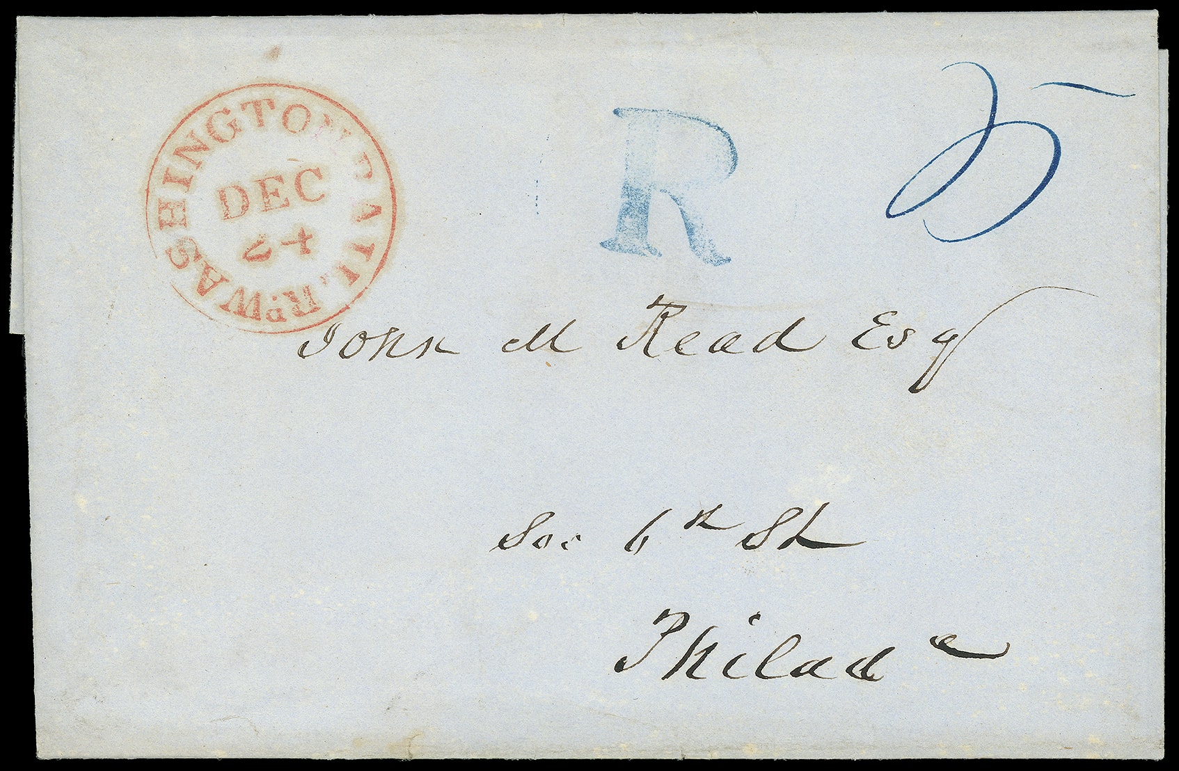 360     R-PH-1 imagePhiladelphia Pa. Large Blue "R". Partial strike on fresh blue 1845 folded letter with red "Washington Rail Rd. Dec 24" railroad route agent cds with blue ms. "5" cent rating to Philaldephia Pa., Extremely Fine and choice railroad use.