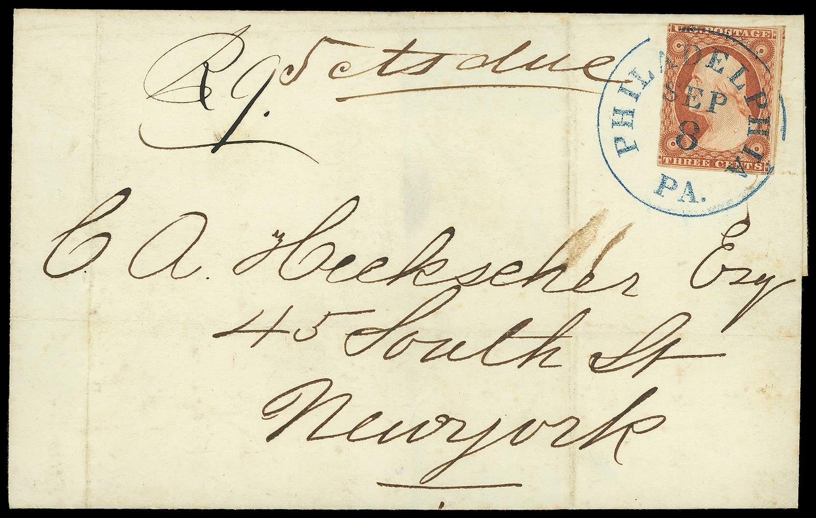 356       imagePhiladelphia "R 9." . Manuscript registry marking on 1851 folded cover bearing 3¢ orange brown (10), large margins to slightly in, tied by sharp blue "Philadelphia Pa. Sep 8" cds from the Heckscher to New York City, manuscript "5 cts due" rating; file folds, F.-V.F.