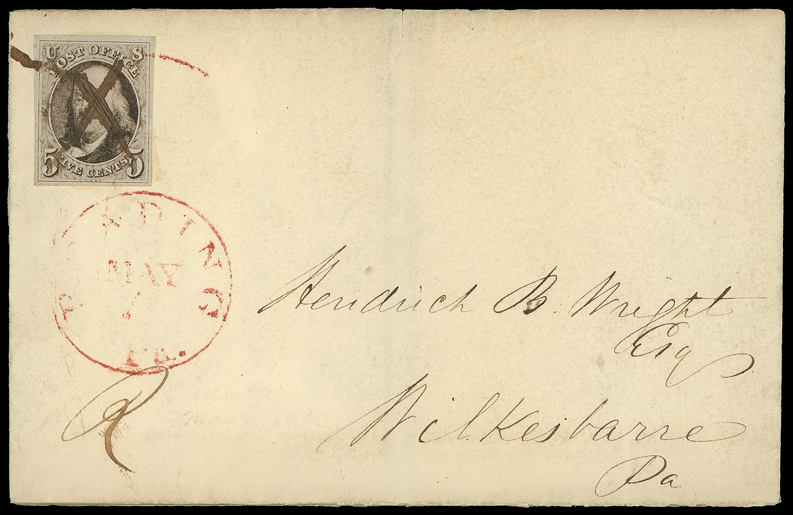 384       imageReading Pa. "R". Manuscript "R" registry marking, matching ms. "X" cancel ties 5¢ dark brown (1a), large margins, partial red "Reading Pa. May 7" cds on 1849 folded letter to Wilkes-Barre Pa.; small cover tear at top center, Very Fine.