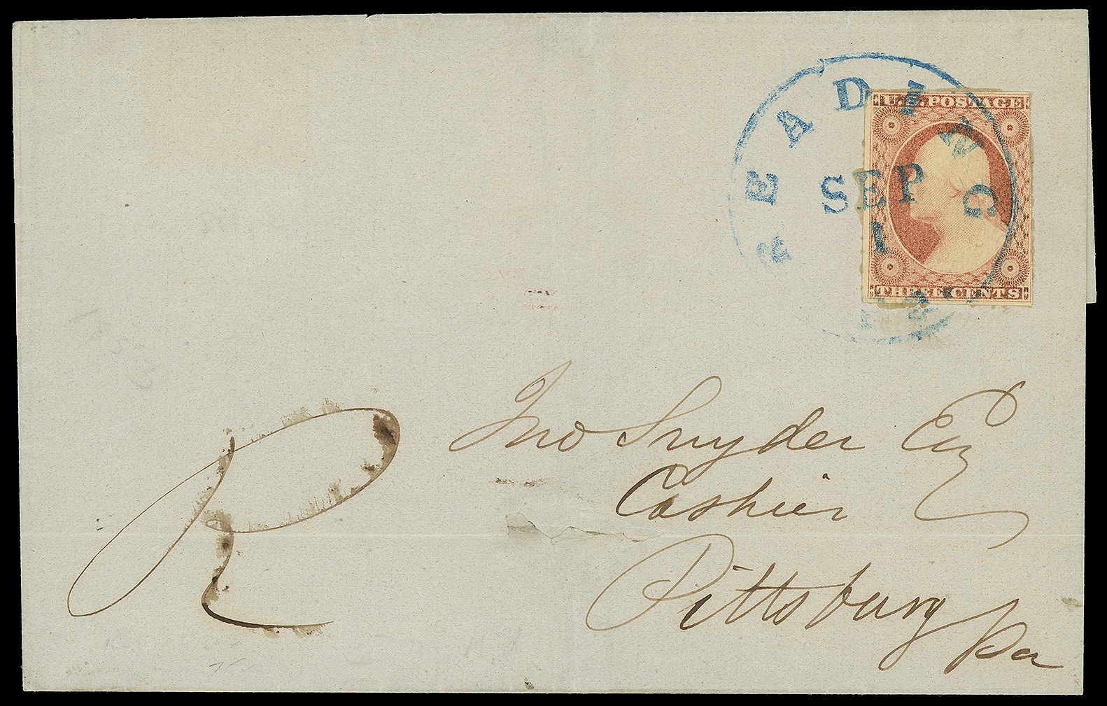 385       imageReading Pa. "R". Large manuscript "R" on circa 1854 gray folded cover bearing 3¢ dull red (11A), full to large margins except slightly in at right, tied by blue "Reading Pa. Sep 1" cds to Pittsburgh Pa.; internal address tear, otherwise Very Fine and scarce early registry use.