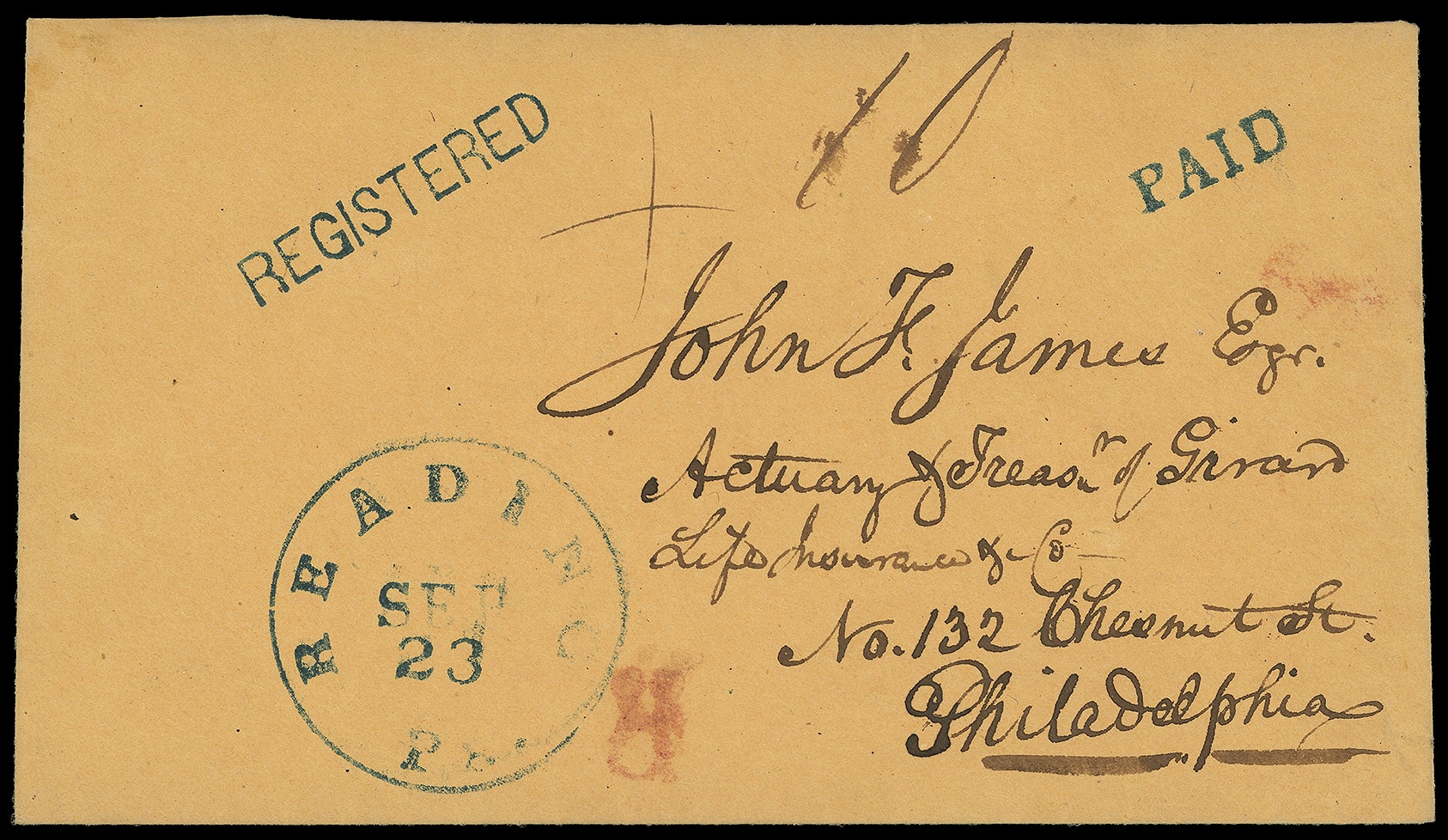386     R-RE-1 imageReading Pa. "Registered". Perfect blue straightline and manuscript "10" registry notation, matching blue "Reading Pa. Sep 23" cds and "Paid" h.s. on 1852-53 orange cover to Philadelphia Pa., upon receipt small red "R" registered handstamp, additional ms. "X" registry notation, Very Fine and choice.