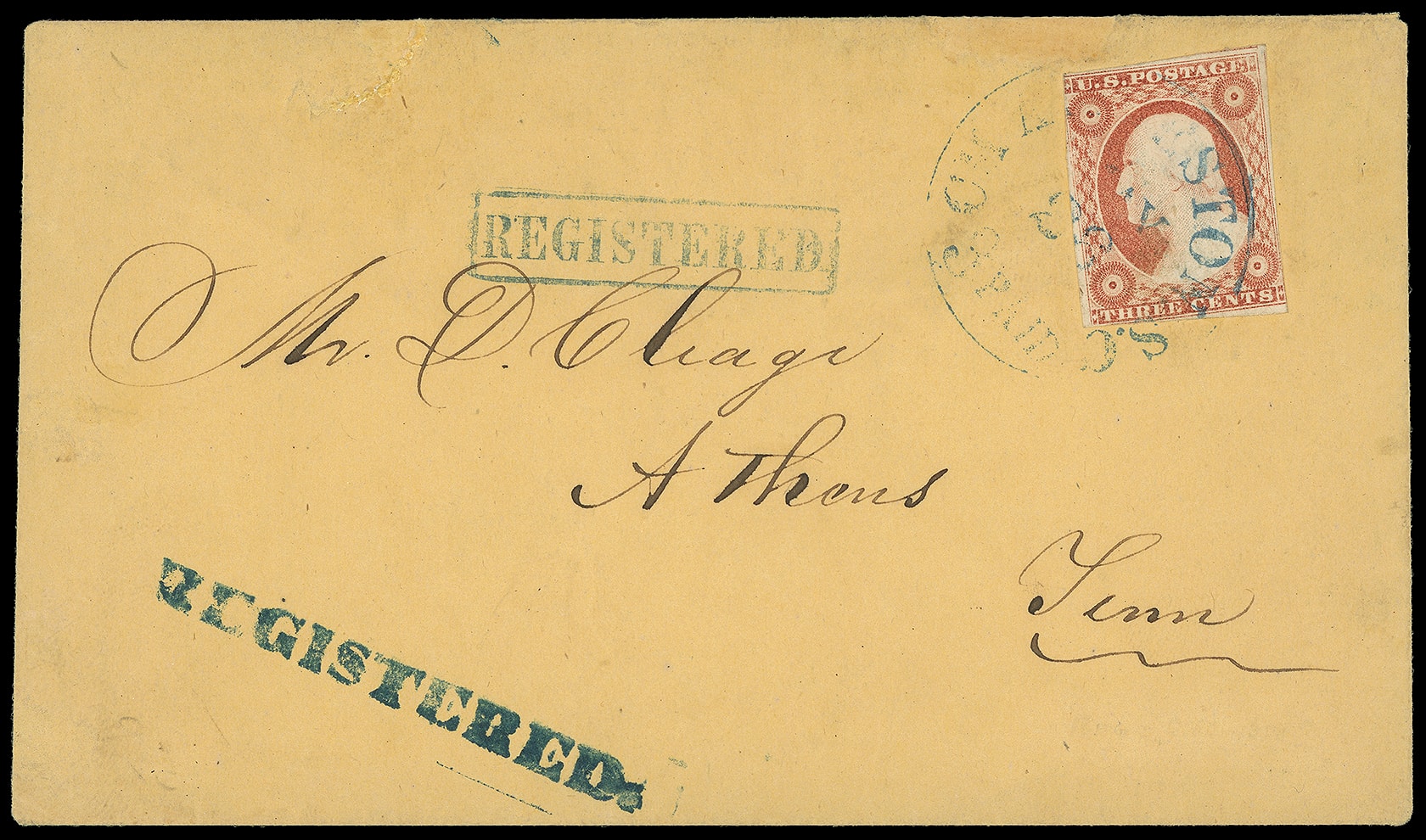 394     R-ATH-1 imageAthens, Tenn. "Registered." . Bold blue straightline as receiver on buff cover bearing 3¢ dull red (11A) tied partial "Charleston S.C. '3 Paid' May 26" integral-rate cds, matching "Registered" framed handstamp (Milgram R-CHA-1) to Athens Tenn.; repaired top edge tears, partial flap, Very Fine appearance, the only recorded classic cover with two different "registered" handstamps.
