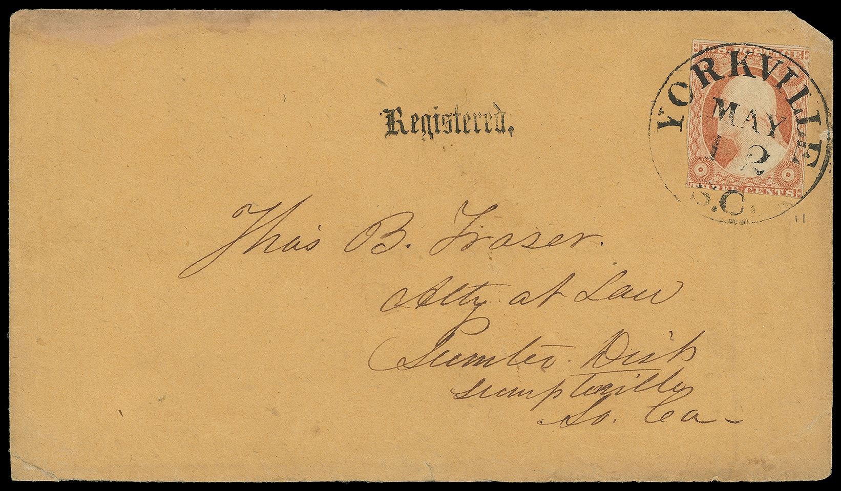 393     R-YO-1 imageYorkville S.C. "Registered". Old-English type straightline, matching "Yorkville S.C., May 12" cds ties 3¢ dull red (11A), margins to in, to Summerville S.C.; light top left edge stain, upper right corner clipped, otherwise Very Fine.