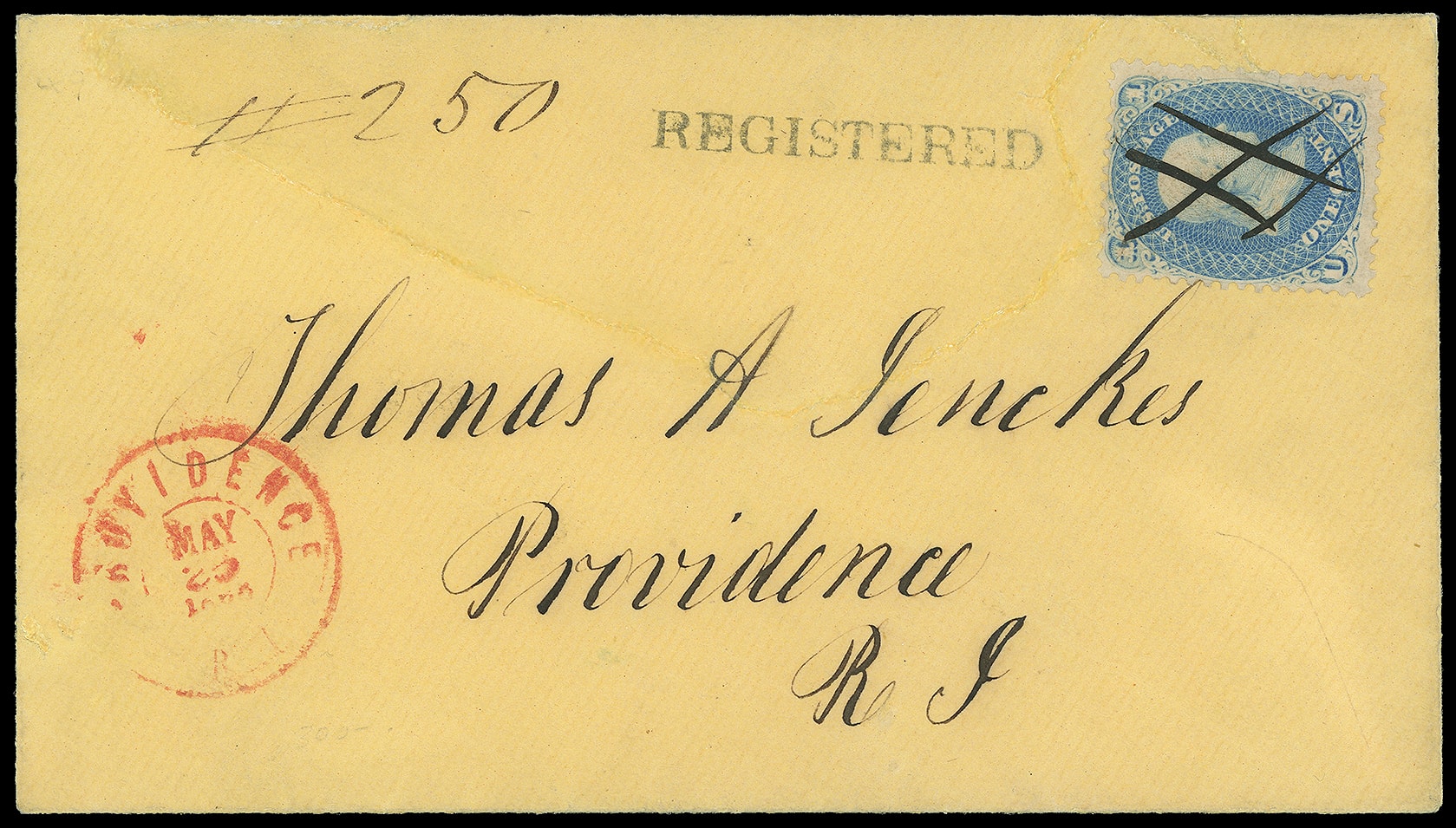 390     R-PV-1 imageProvidence R.I. "Registered". Straightline with ms. "250" registry number, red "Providence R.I. May 25, 1863" cds on yellow drop cover bearing pen canceled 1¢ blue (63) to local address; large repaired tearscover repaired and cleaned, attractive and Very Fine appearance, the earliest recorded registered drop cover, ex-Flack.
