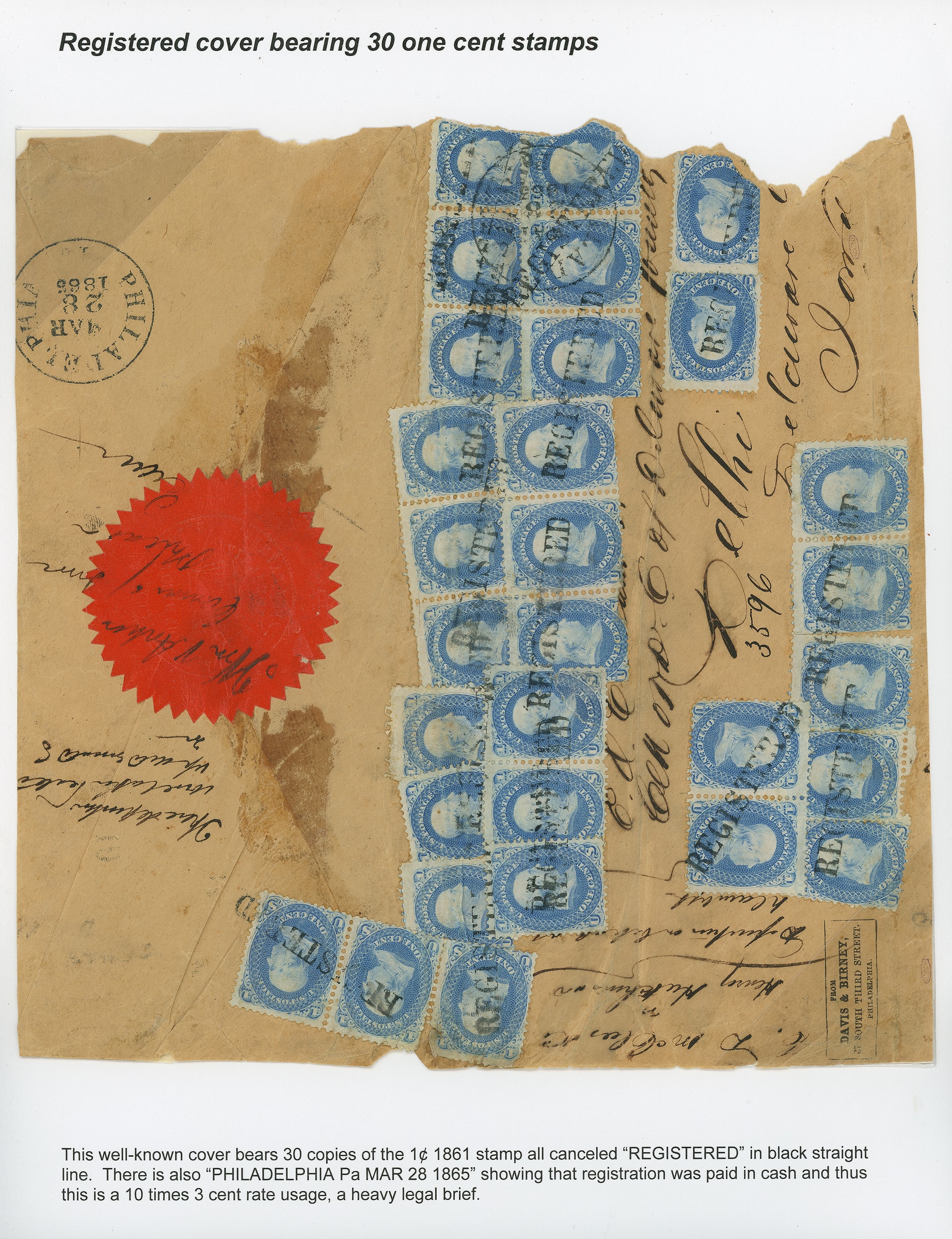381     R-PH-7 imagePhiladelphia Pa. "Registered". Blue 43mm straightliness cancel 30 copies of 1¢ blue (63) on front and reverse, matching "Philadelphia Pa. Mar 28, 1865" cds backstamp on legal-size buff envelope transporting court documents to Delhi, Iowa; opened out for display with some creasing and opening defects, Fine and unique 1¢ franking, prepaying the 20¢ registry fee and overpaying by 1¢ three times the domestic letter rate of 3¢ per ounce.