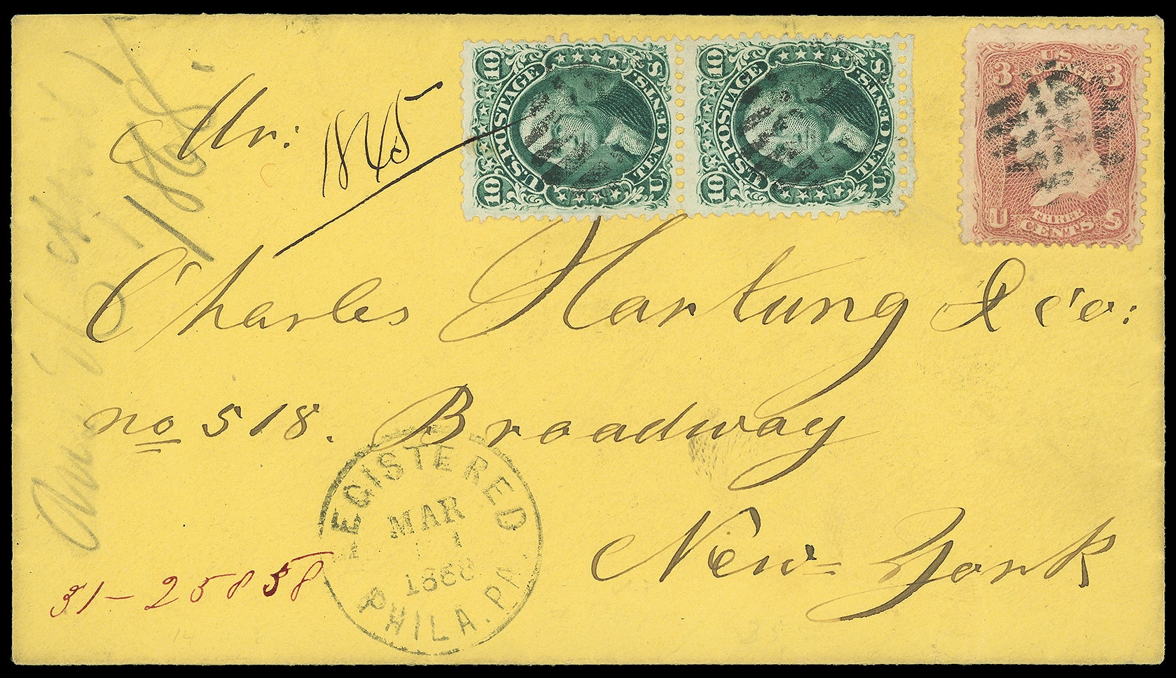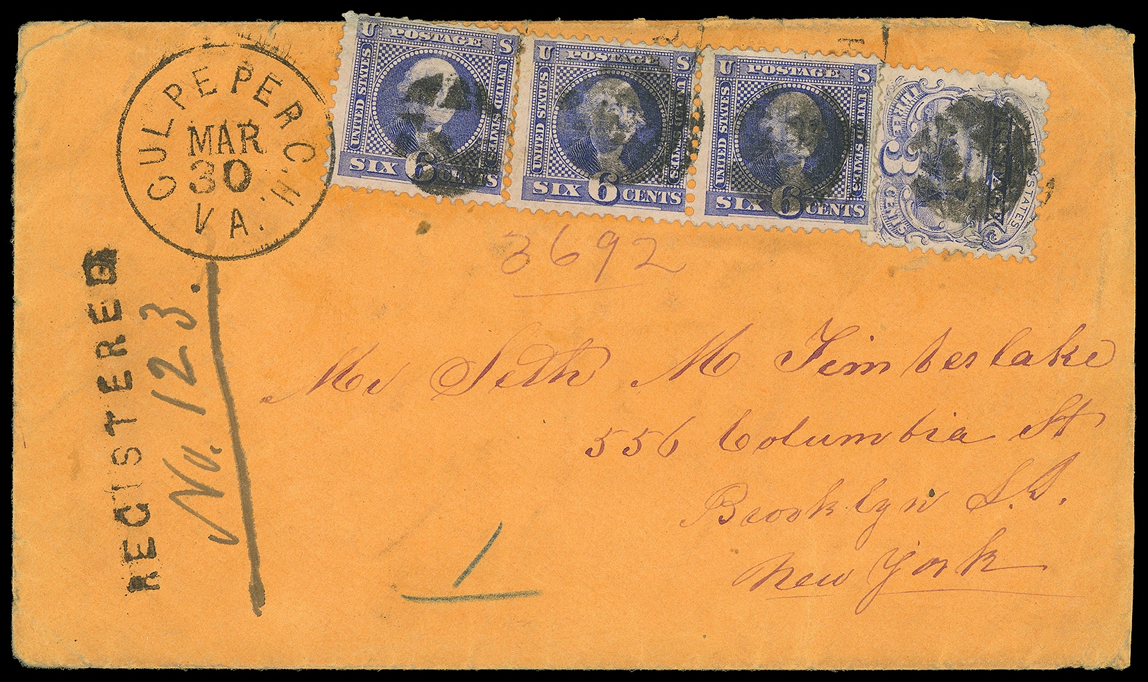 398       imageCulpeper C.H., Va. "Registered". Straightline and blue ms. "No. 123." registry number, on 1870 registered orange cover bearing 3¢ ultramarine (114) and 6¢ ultramarine (115) single and pair, couple stamp flaws, tied by small cork cancels duplexed with bold "Culpeper C.H. Va. Mar 30" cds to Brooklyn N.Y.; couple small stamp flaws, cover reduced at right, flap tears, F.-V.F. and unique 1869 issue registered franking.