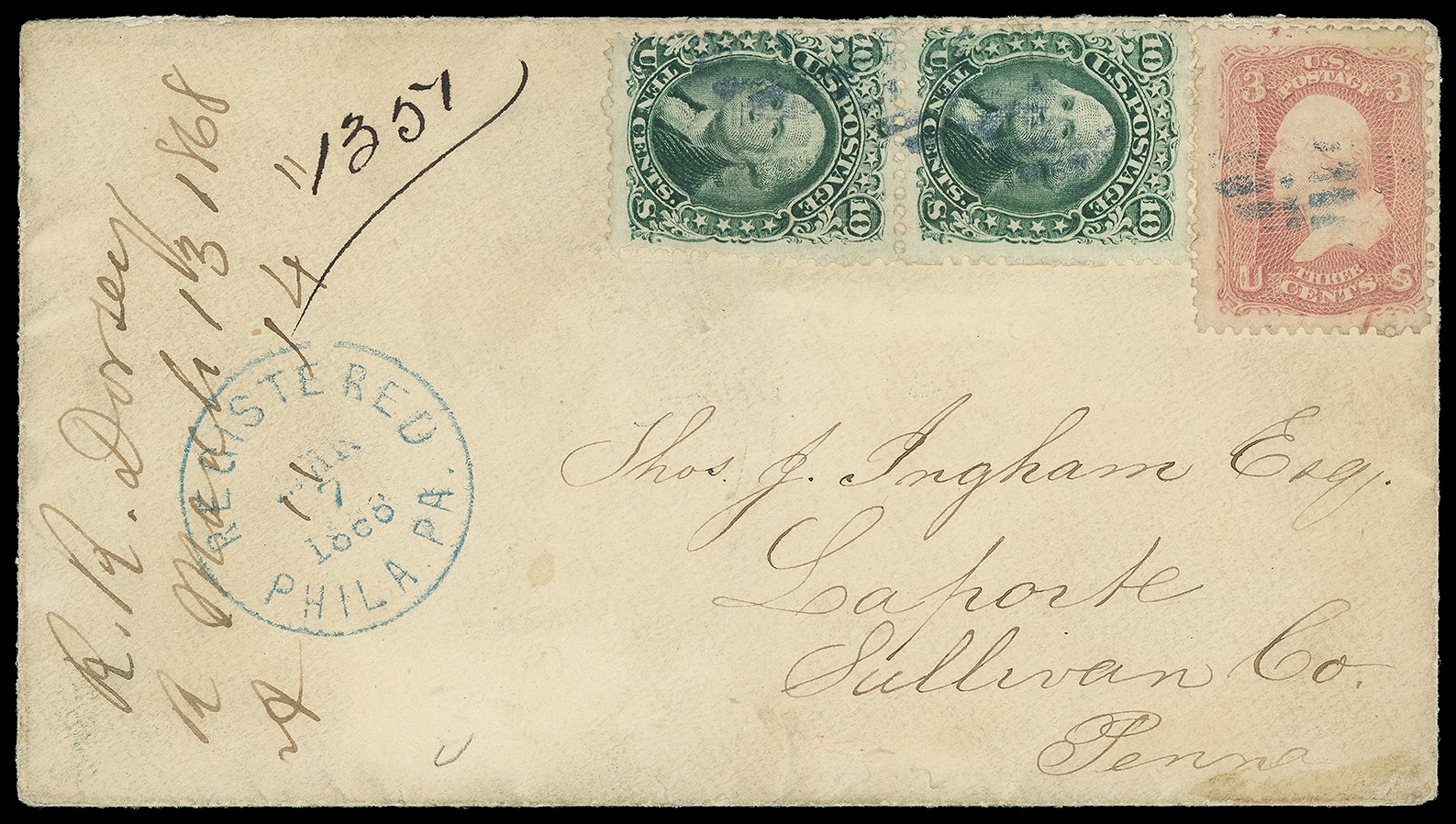 383     R-PH-8, R-PH-9 imageRegistered, Phila. Pa. Black Mar. 1 and blue Mar. 7 cds strikes on two 1868 covers, each bearing 3¢ rose (65) and 10¢ green, E. grill (89) vertical pair tied by segmented grid cancels in respective black and blue to New York City and Laporte Pa.; later with couple stamp flaws, flap replaced, F.-V.F. pair.