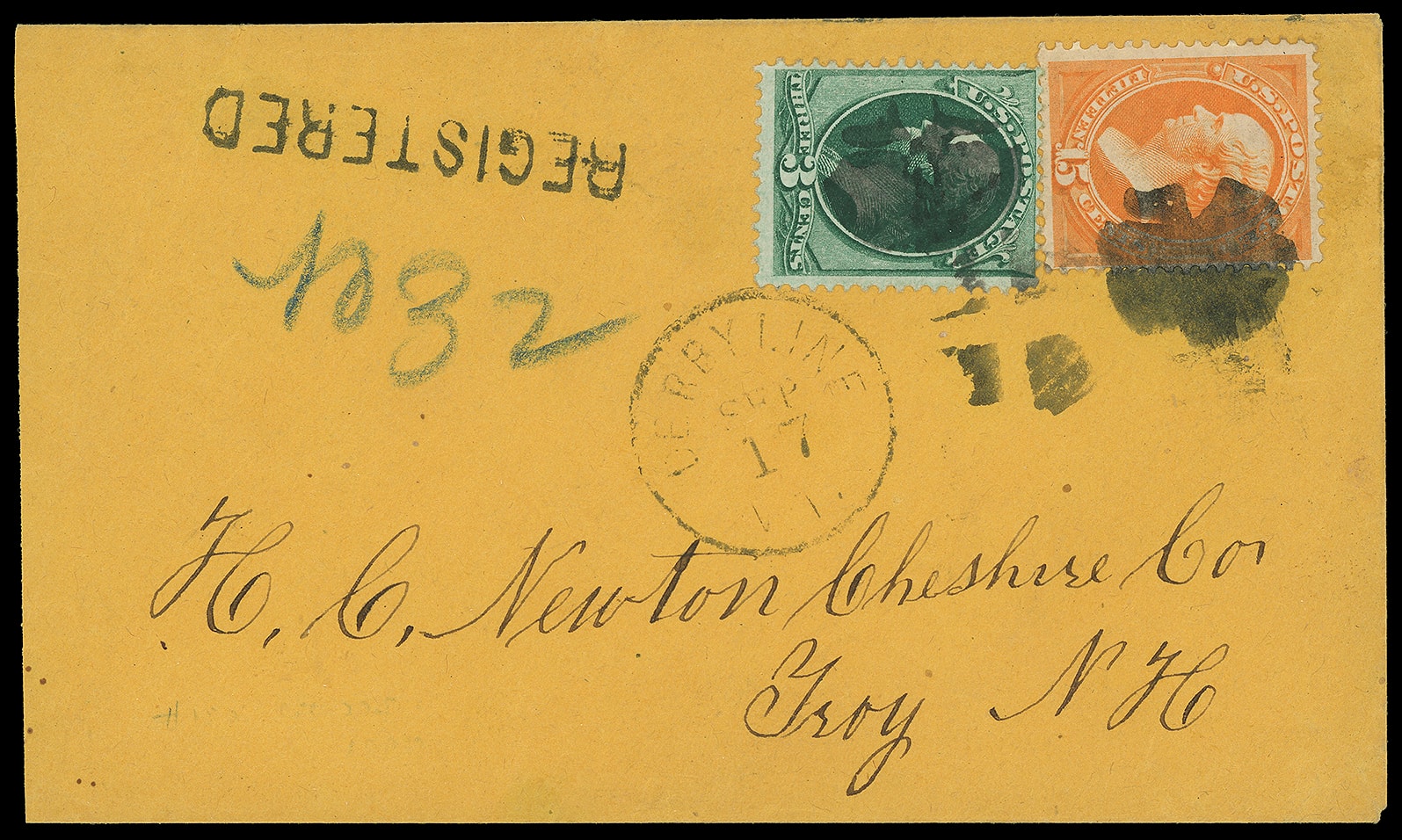397       imageDerbyline Vt. Sep 17. Cds with "Registered" straightline and blue crayon "No 32" registry number on circa 1874 orange cover bearing 3¢ green (158) and 15¢ yellow orange (163), rich colors, canceled by cork cancels and cross-roads duplexed with Derbyline cds to Troy N.H.; reduced slightly at left, Very Fine.