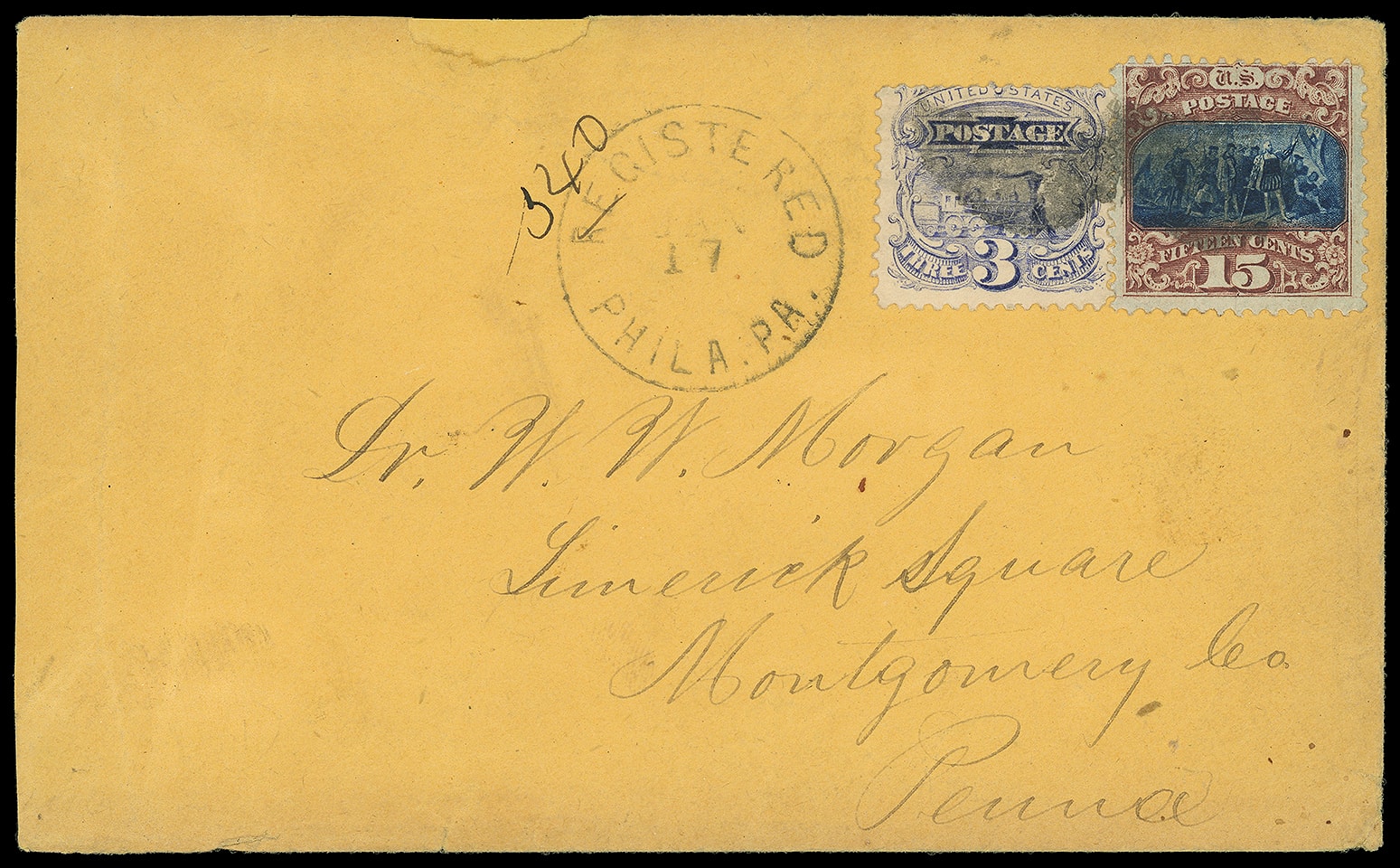 382     R-PH-8 imageRegistered, Phila. Pa. Jan 17. Cds with matching cork cancels tie 3¢ ultramarine (114) and 15¢ brown & blue (119) on 1870 orange cover to Limerick Square Pa., ms. "340" registry number; small top edge mend and reduced slightly at left, Fine appearance.