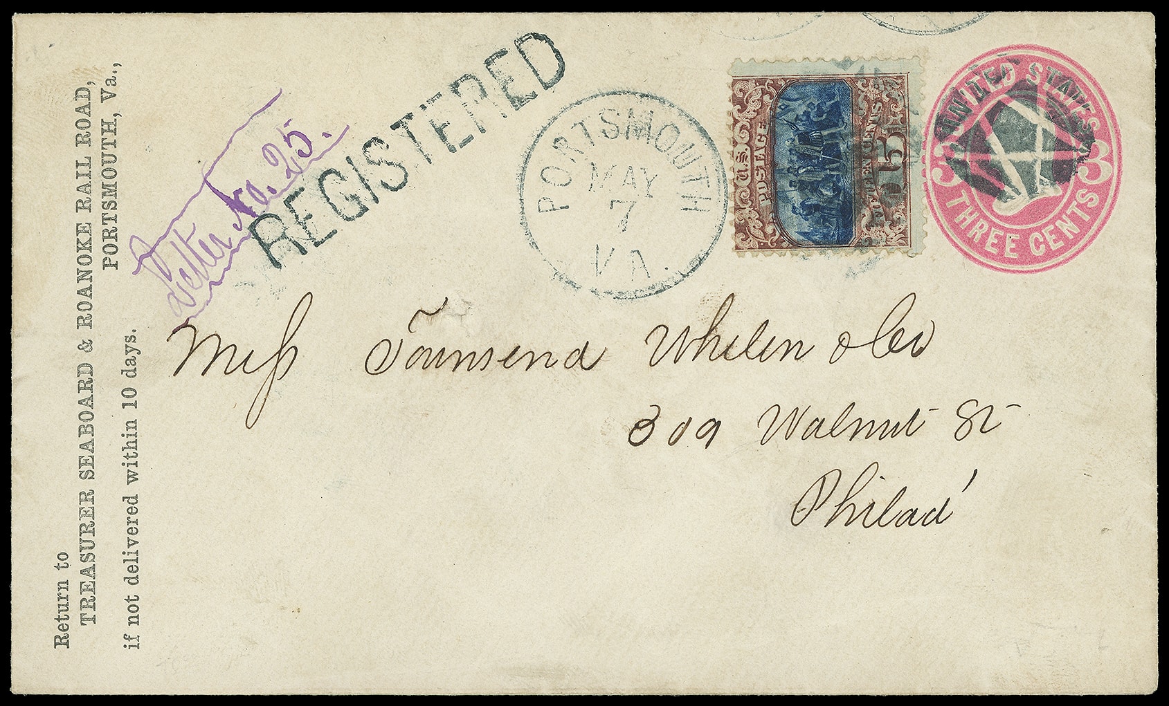 400     R-PR-1 imagePortsmouth Va. "Registered". Neat straightline with purple ms. "Letter No. 25.", matching "Portsmouth Va. May 7" cds duplexed with incised star cancel ties 15¢ brown & blue (119) on 3¢ pink (U58) entire to Philadelphia Pa., flap with remnant of registry return receipt; closed spindle hole, otherwise Very Fine and scarce registered fancy cancel use.