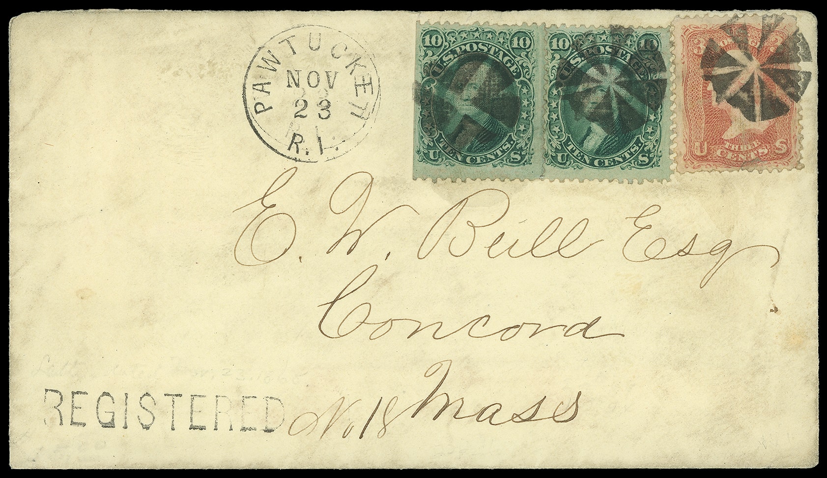389     R-PW-1 imagePawtucket R.I. "Registered". Straightline with ms. "No. 18", on amber cover bearing 3¢ rose (88) and two 10¢ green (89) s.e. singles, crossroads duplexed with "Pawtucket R.I. Nov 23" cds ties left 10¢, other stamps tied by matching circle of wedges cancels to Concord Mass.; light soiling, no flap, 3¢ small tear, F.-V.F. Scott No. 89 $700 as used singles.