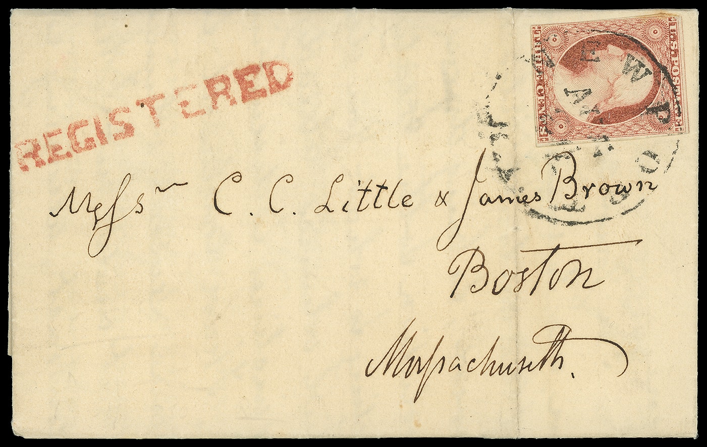388     R-NT-1 imageNewport, R.I. "Registered". Red 4½ x 48½mm straightline on 1854 folded letter bearing 3¢ dull red (11A), margins to slightly in, tied by "Newport R.I. Aug 24" cds to Boston Mass., letter from George Bancroft to publishers Little & Brown discussing his work "The History of the American Revolution to the Treaty of Peace" to be added to five already published volumes, Very Fine.