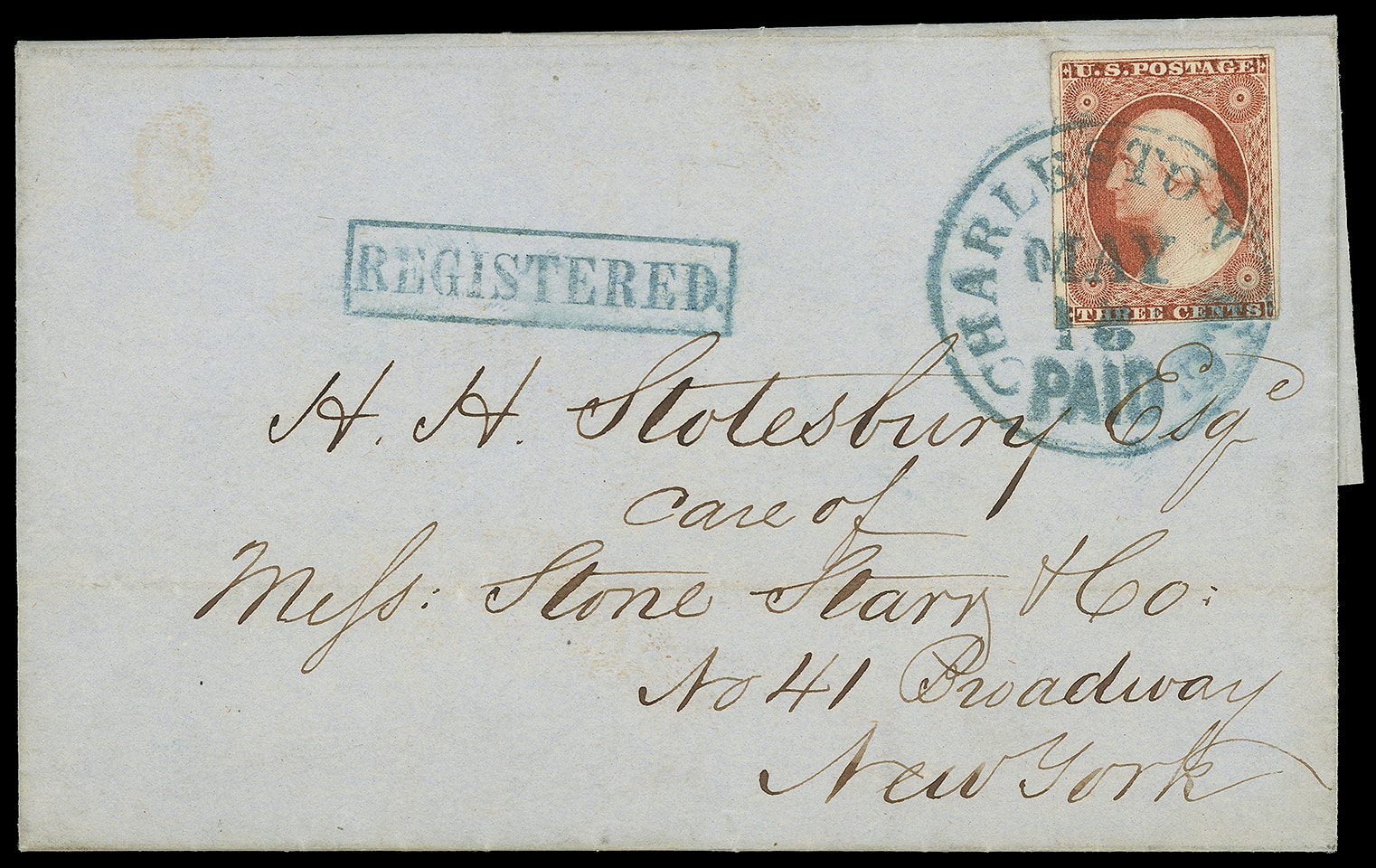 391     R-CHA-1 imageCharleston S.C. "Registered." . Neat blue framed handstamp, matching bold blue "Charleston S.C. 'Paid' May 16" cds ties 3¢ dull red (11A), three large margins, on 1852 blue folded letter to New York City; light horizontal fold, Very Fine and striking unofficial registered cover.
