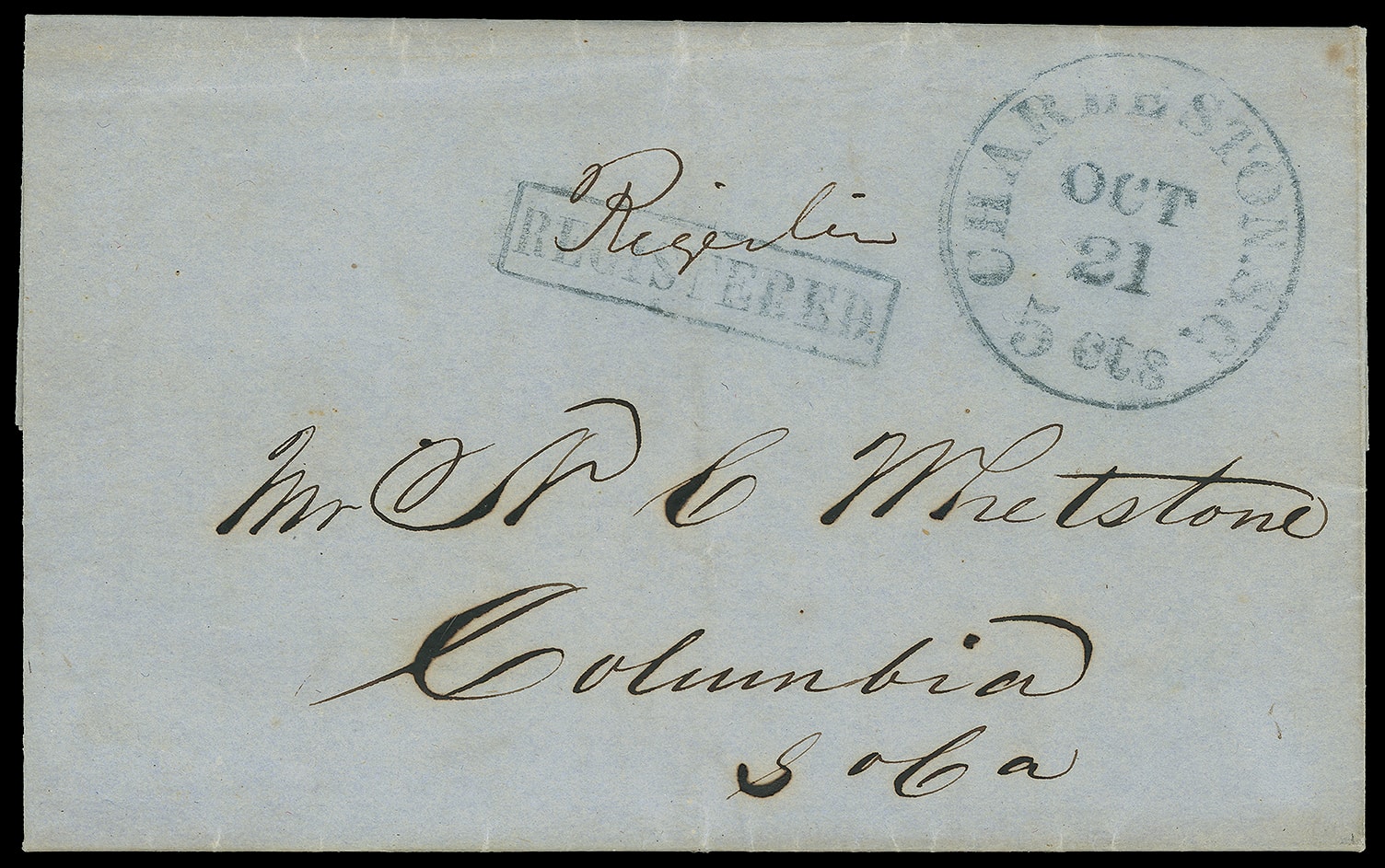 392     R-CHA-1 imageCharleston S.C. "Registered." . Blue framed handstamp, matching blue "Charleston S.C. '5 cts' Oct 21" cds on 1853 blue folded letter to Columbia S.C., additional ms. "Registered", letter indicated $50 enclosed, fresh and Very Fine.
