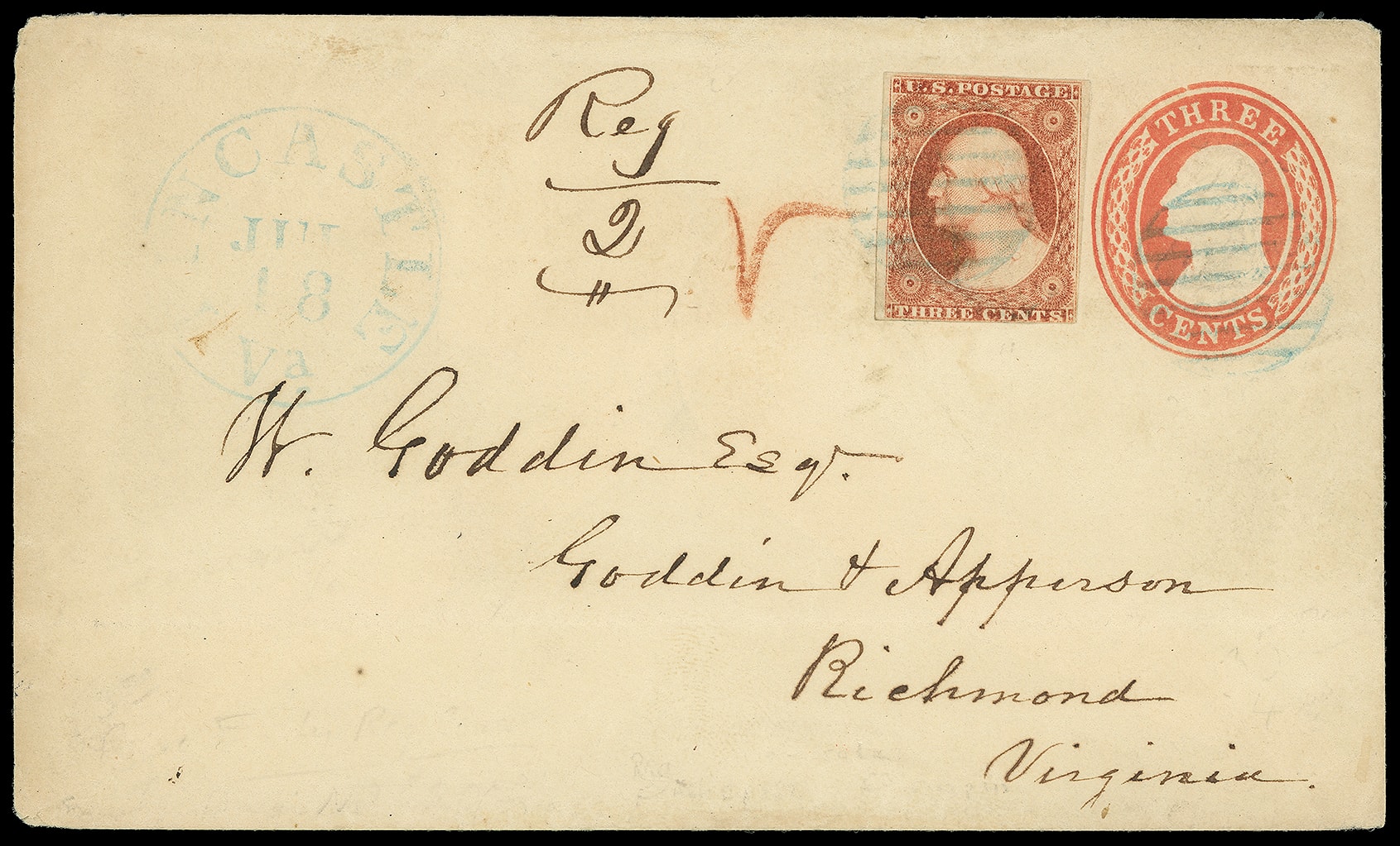 399       imageLancaster Va. "Reg / 2". Manuscript registry postmark on 3¢ red (U9) Nesbitt entire uprated with 3¢ dull red (11), large margins to touched, tied by blue circular grid cancel, matching light "Lancaster Va. Jul 18" cds to Richmond Va. where red crayon registry check mark probably applied; flap torn, 3¢ preprint wrinkle, fresh and Very Fine.