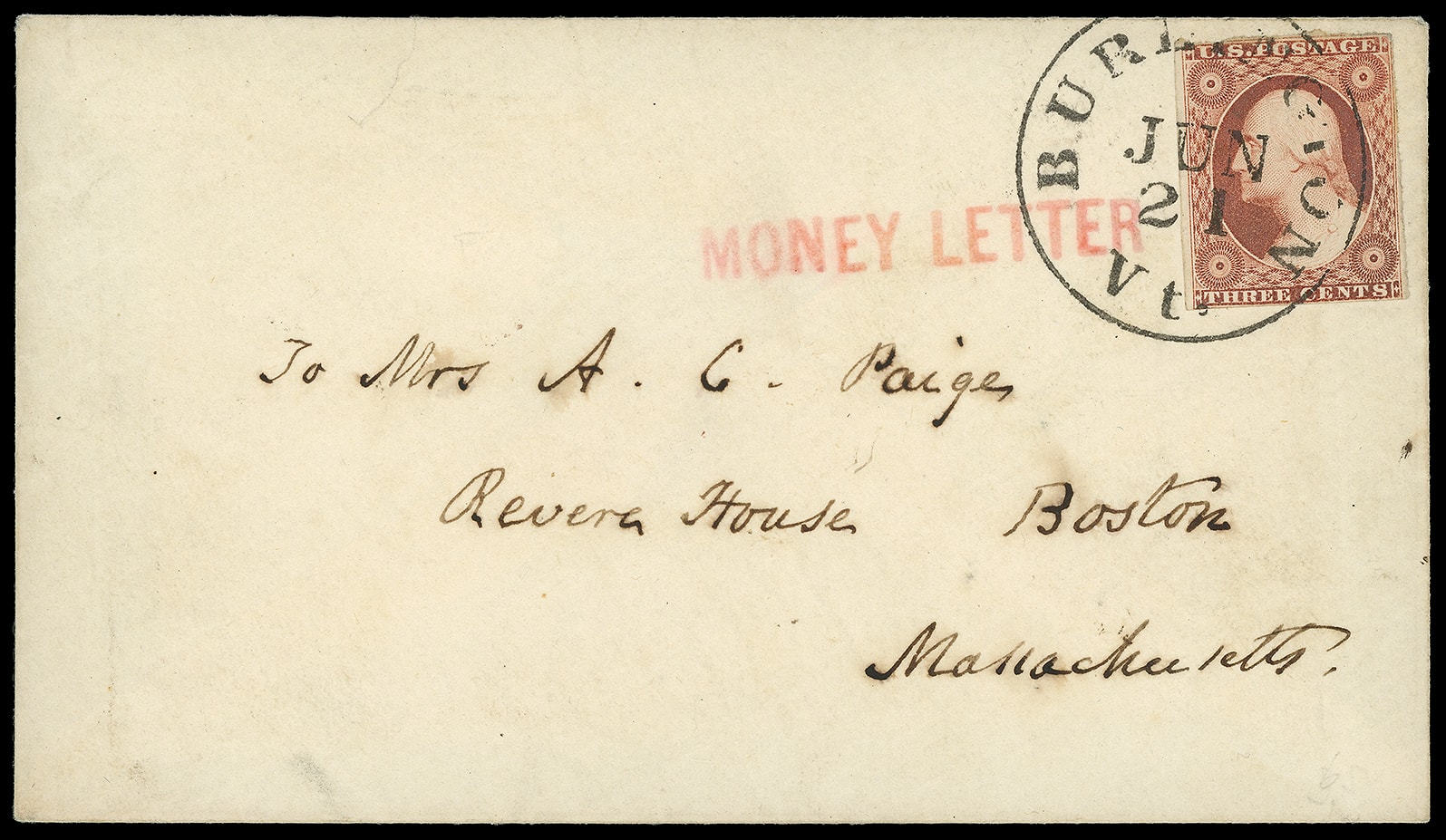 396     R-BU-1 imageBurlington Vt. "Money Letter". Red straightline on cover bearing 3¢ dull red (11A) large margins to in, tied by "Burlington Vt. Jun 21" cds to Boston Mass.; bit of flap missing, Very Fine and rare money letter use, only two recorded examples.