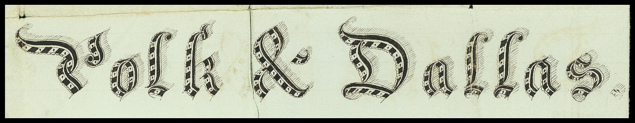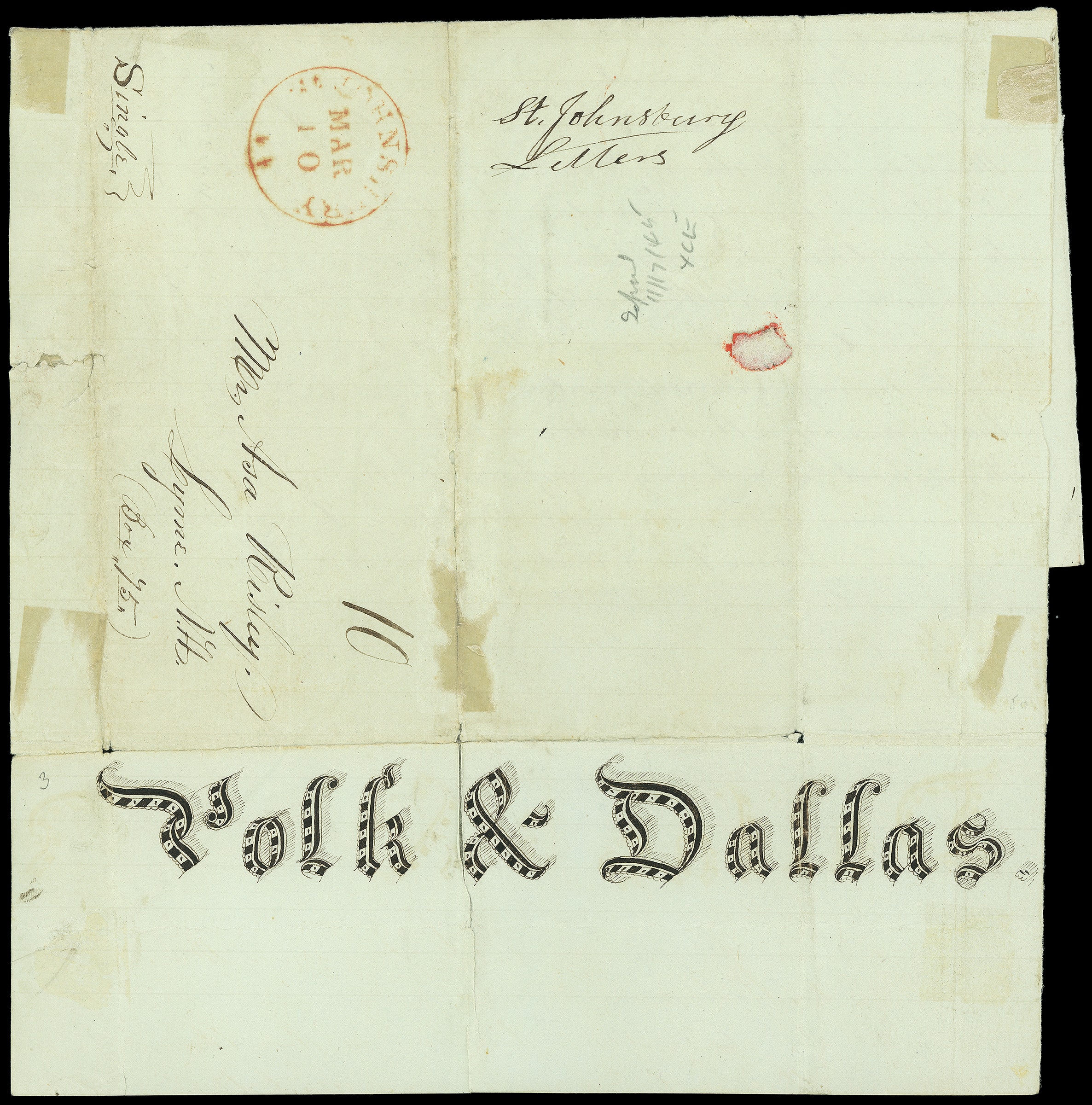 65     JP-unlisted image(1844 Campaign) James K. Polk, George Dallas. Extremely well-executed ornate hand-drawn "Polk & Dallas" ink straightline across side flaps of folded letter datelined "St. Johnsbury Mar 5 1845", entered mails with red "St Johnsbury Vt. Mar 10" cds and manuscript "10" rating to Lyme N.H.; some hinge reinforced file folds; some hinge re-inforced filefolds, otherwise Very Fine and unique 1844 campaign design.