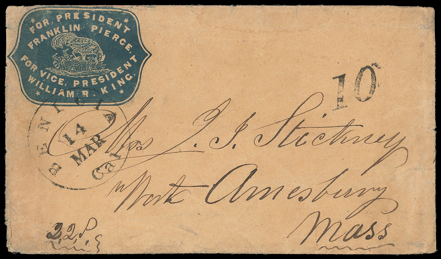 76     FP-3 image(1852 Campaign) Franklin Pierce, William King. Blue embossed shield cameo corner card "For President Franklin Pierce, For Vice President William R. King" showing image of rooster conquering a coon on buff cover with "Benicia, Cal. 14 Mar" cds and matching large italic "10" rating handstamp to North Amesbury, Mass.; edge wear; edge wear, Very Fine, ex-Gabriel.