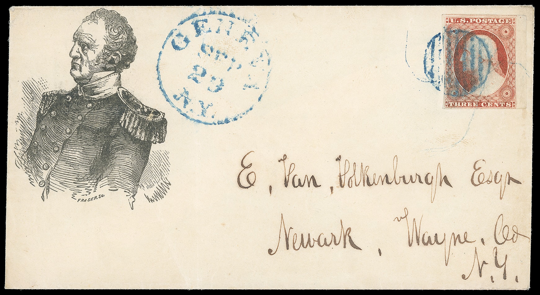 78     WS-3 image(1852 campaign) Winfield Scott. Engraved middle-aged portrait design of the general in uniform, Fraser engraver's imprint, on fresh cover bearing 3¢ claret (11A), right sheet margin single, four margins, tied by blue circular grid cancel, matching blue "Geneva N.Y. Sep 23" cds to Newark N.Y., a Superb gem.