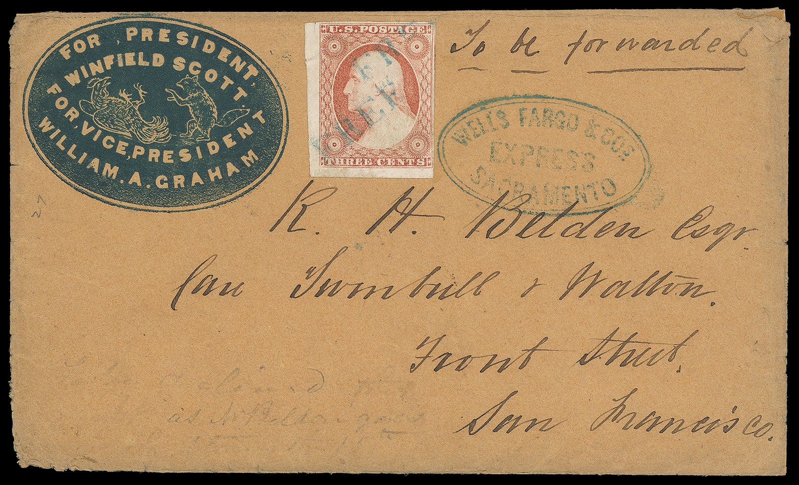 79     WS-4 image(1852 Campaign) Winfield Scott, William Graham. Blue oval illustrated cameo corner card "For President Winfield Scott, For Vice President William Graham" depicting racoon and rooster fighting, on buff cover bearing 3¢ dull red (11A) bottom left corner margin single tied by blue "Free" straightlines, blue "Wells Fargo & Co's. Express, Sacramento" oval handstamp to San Francisco Cal., endorsed "To be forwarded" at upper right; some edge wear; edge flaws, not mentioned on certificate still, Very Fine, with 2020 P.F. certificate.