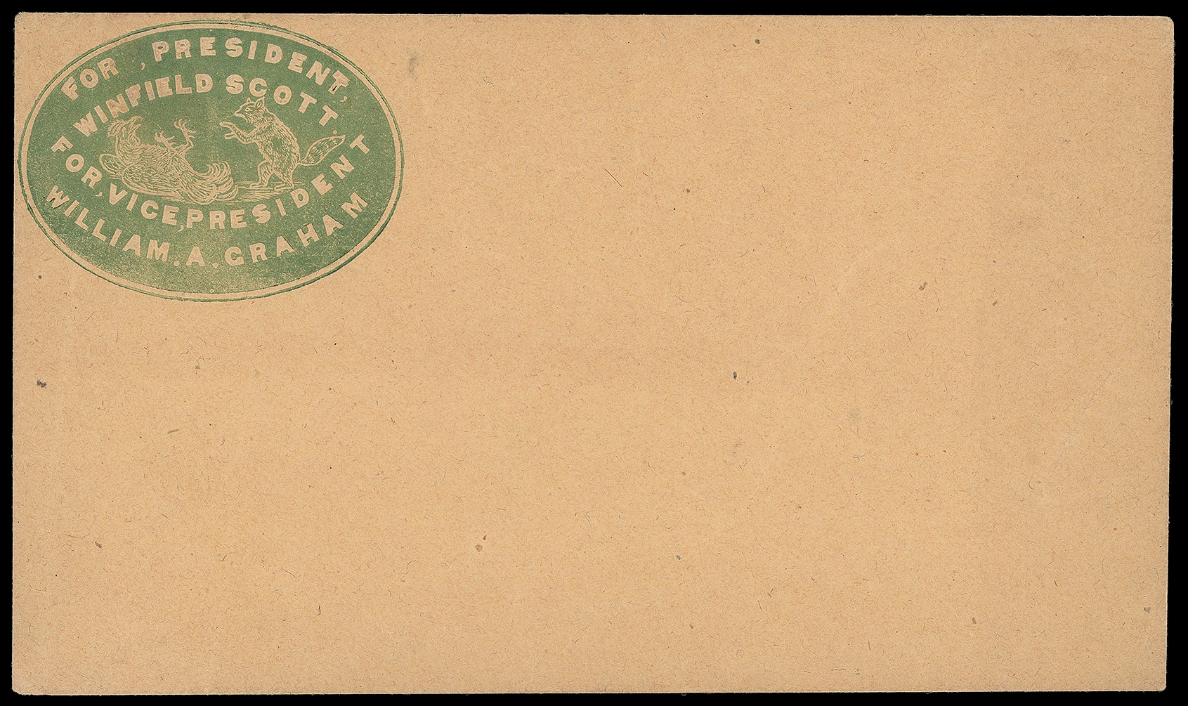 80     WS-4 var. image(1852 campaign) Winfield Scott, William Graham. Green illustrated oval cameo corner card depicting racoon and rooster "For President Winfield Scott, For Vice President William Graham" on unused orange campaign cover, Extremely Fine, the only recorded example in green.