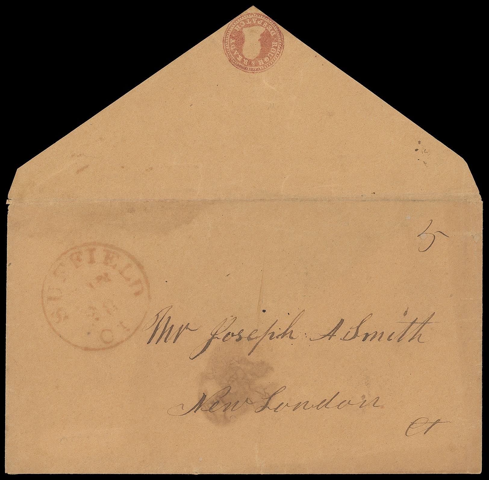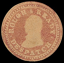 70     ZT-1 image(1848 Campaign) Zachary Taylor. Small embossed red circular cameo of Taylor profile and "Rough and Ready Despatch" caption on backflap of orange buff cover with red "Suffield, Ct Jan 28" cds and manuscript "5" rating to New London Ct.; light wax seal stain, otherwise Very Fine.