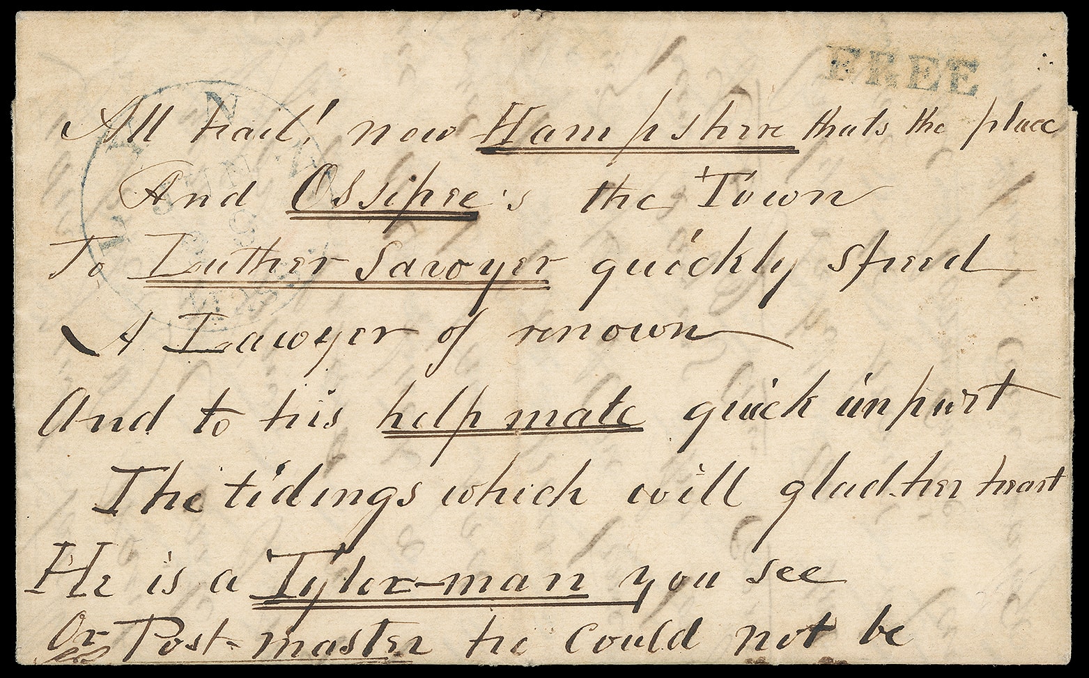 67       image(1844 Campaign) John Tyler. 1844 folded letter with blue "Lynn Mass. Jun 29" cds and "Free" straightline with lengthy pro-Tyler address to Postmaster Luther Sawyer reading "All hail! New Hampshire that the place, and Ossipee's the Town, to Luther Sawyer quickly speed, A Lawyer of renown, And to his help mate quick import, The tidings of which will…, He is a Tyler-man or Post-Master he could not be", long letter, Very Fine and quite unusual use.