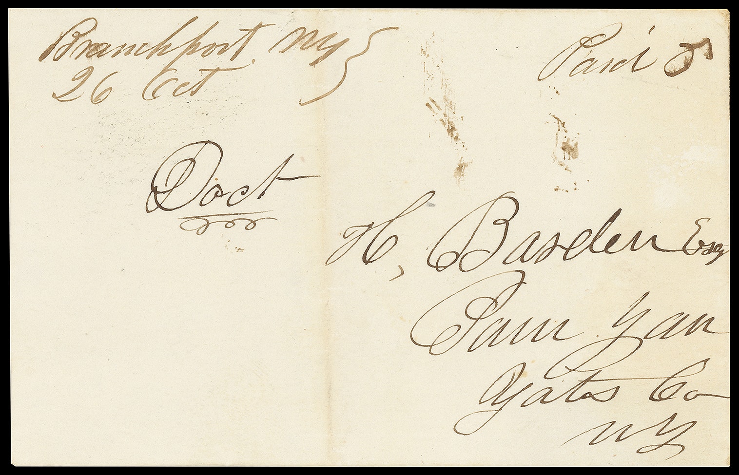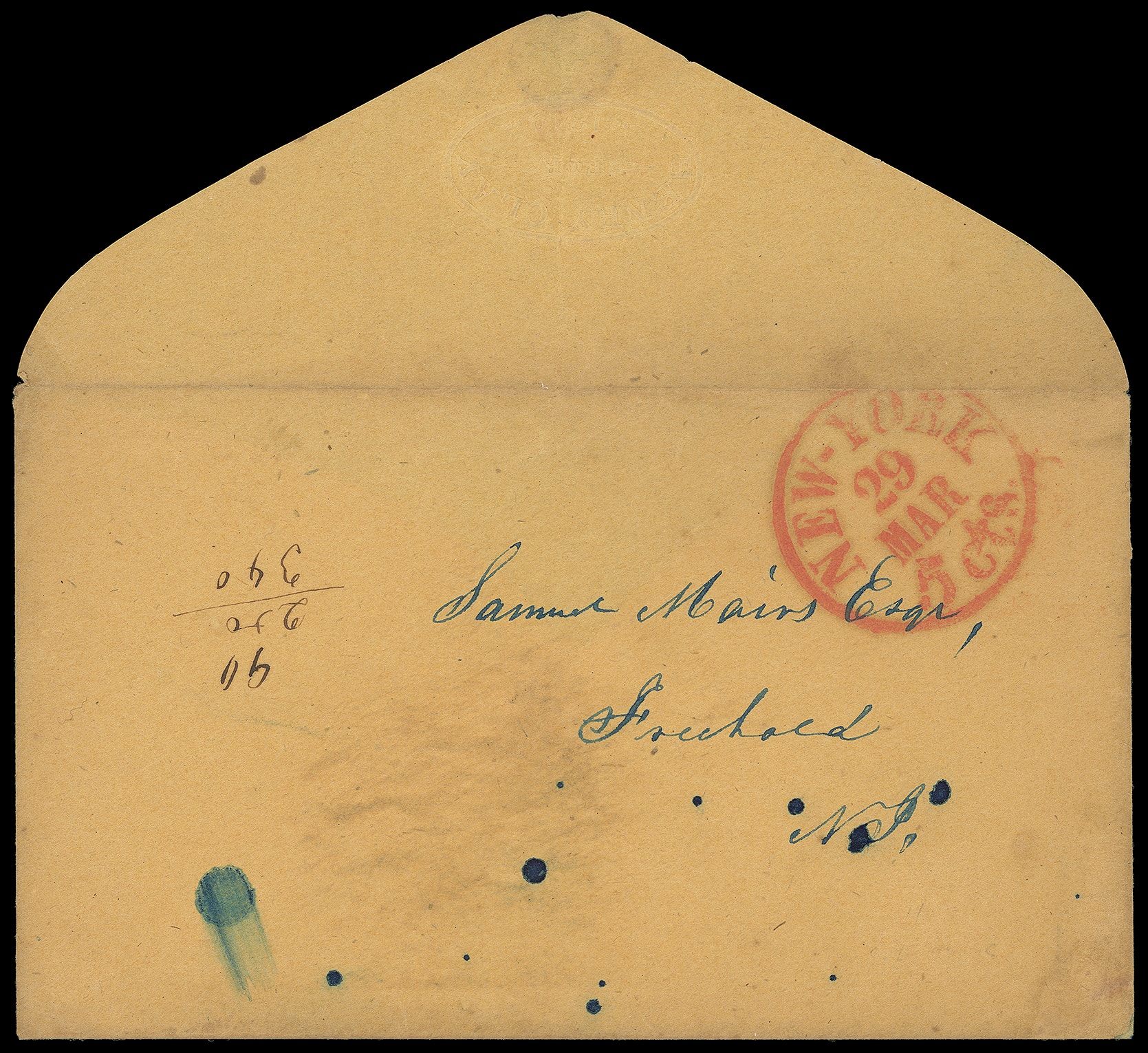 69     HC-15 image(1848 Campaign) Henry Clay. Blind embossed "Henry Clay for 1849" oval campaign design on backflap orange buff cover with red "New York '5cts' 29 May" integral-rate cds to Freehold N.J., with original enclosure, Very Fine, one of the earliest recorded campaign envelopes.