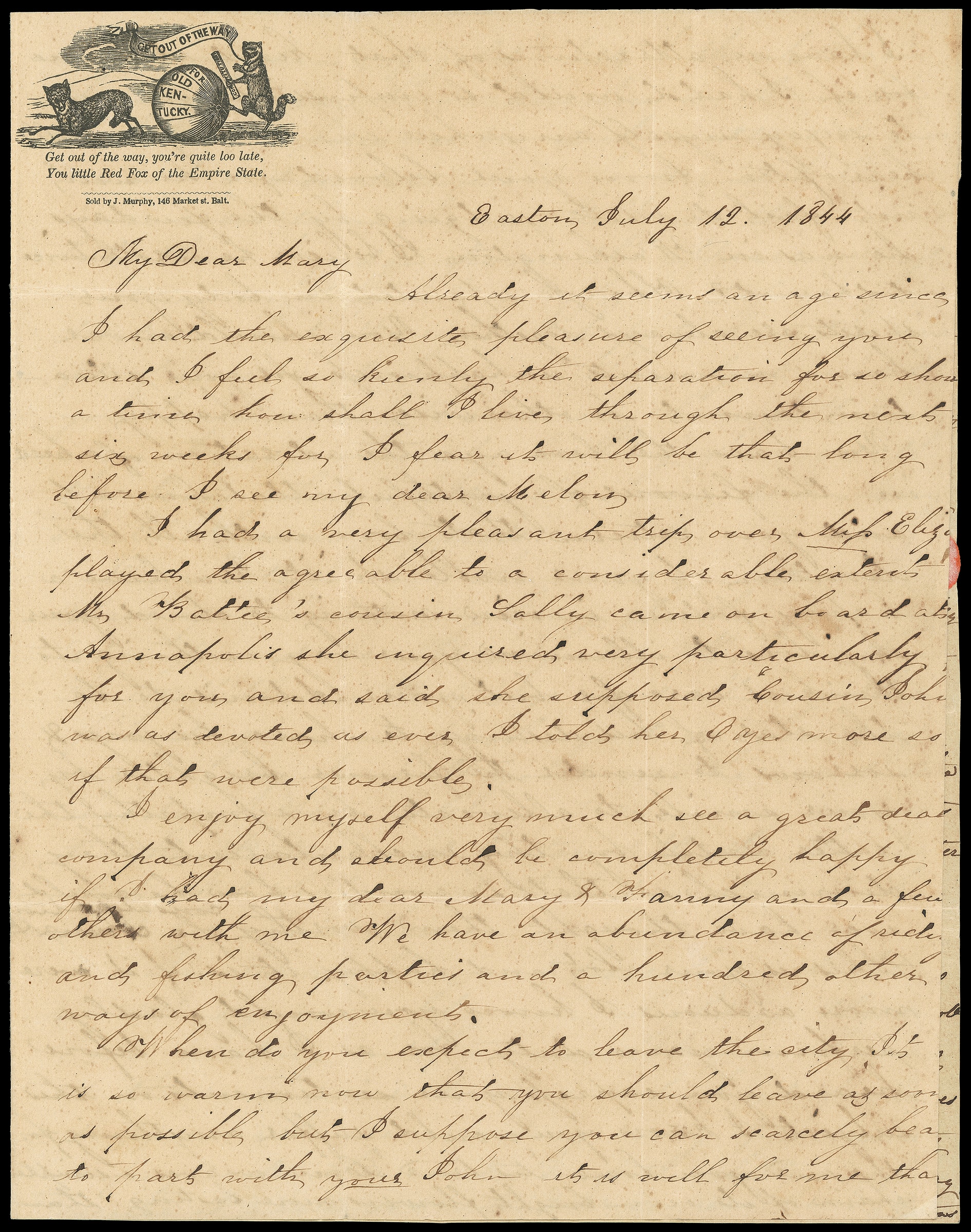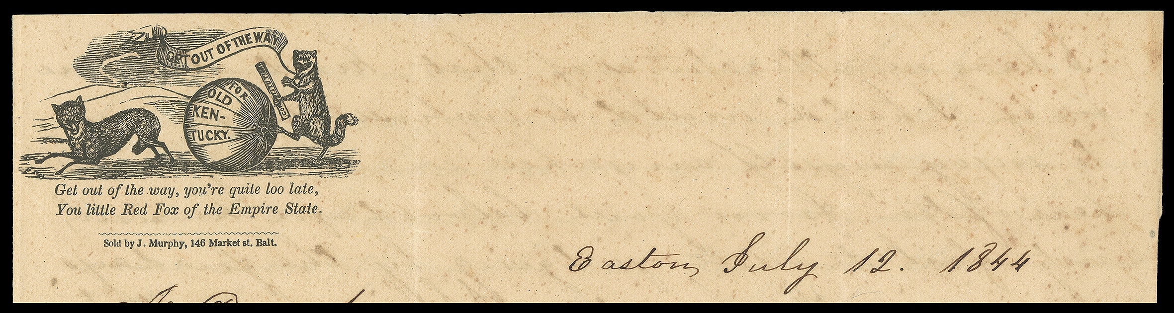 61     HC-11 image(1844 Campaign) Henry Clay Lettersheet. Caricature campaign design showing coon chasing the "little Red Fox of the Empire State.", ball with verse "For Old Kentucky" that refers to Clay, Racoon with Banner "Out of the Way", additional verse below, "Sold by J. Murphy, 146 Market st. Balt." imprint on lettersheet datelined "Easton July 12 1844" and addressed to Baltimore Md. without markings; light overall aging, Very Fine.
