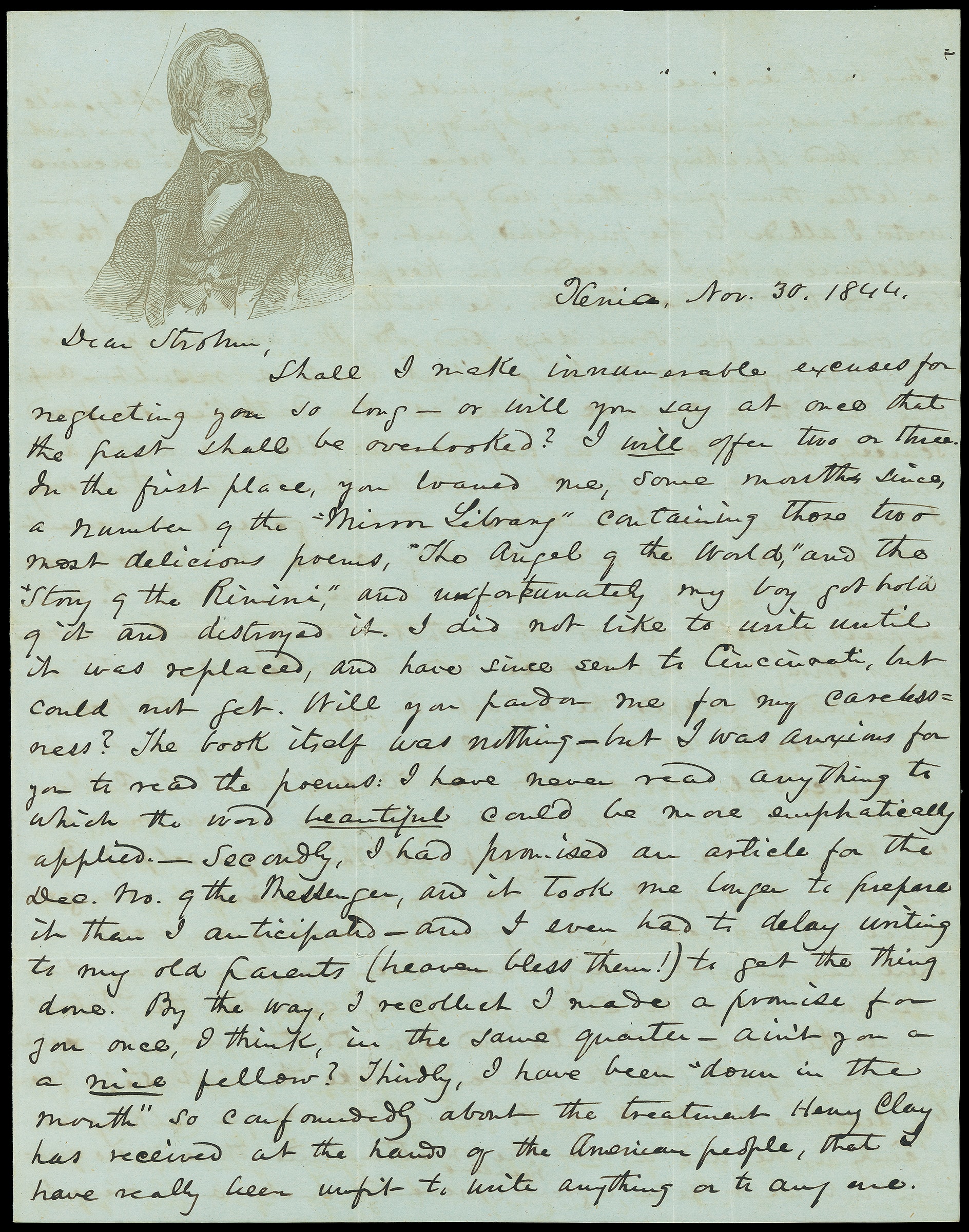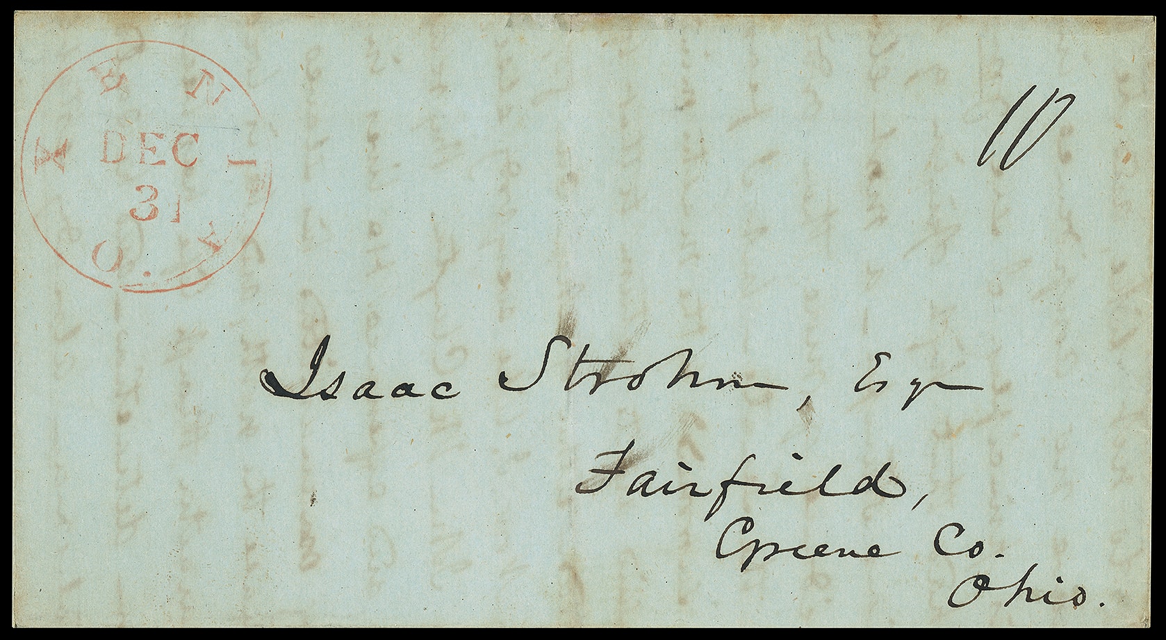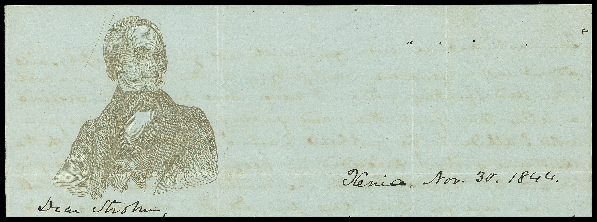 64     HC-unlisted image(1844 Campaign) Henry Clay Lettersheet. Buff portrait campaign design on bluish green lettersheet datelined "Xenia Nov 30. 1844" bearing red "Xenia O. Dec 31" cds and ms. "10" rating to Fairfield, Ohio, Very Fine, similar to Milgram HC-1, only recorded example.