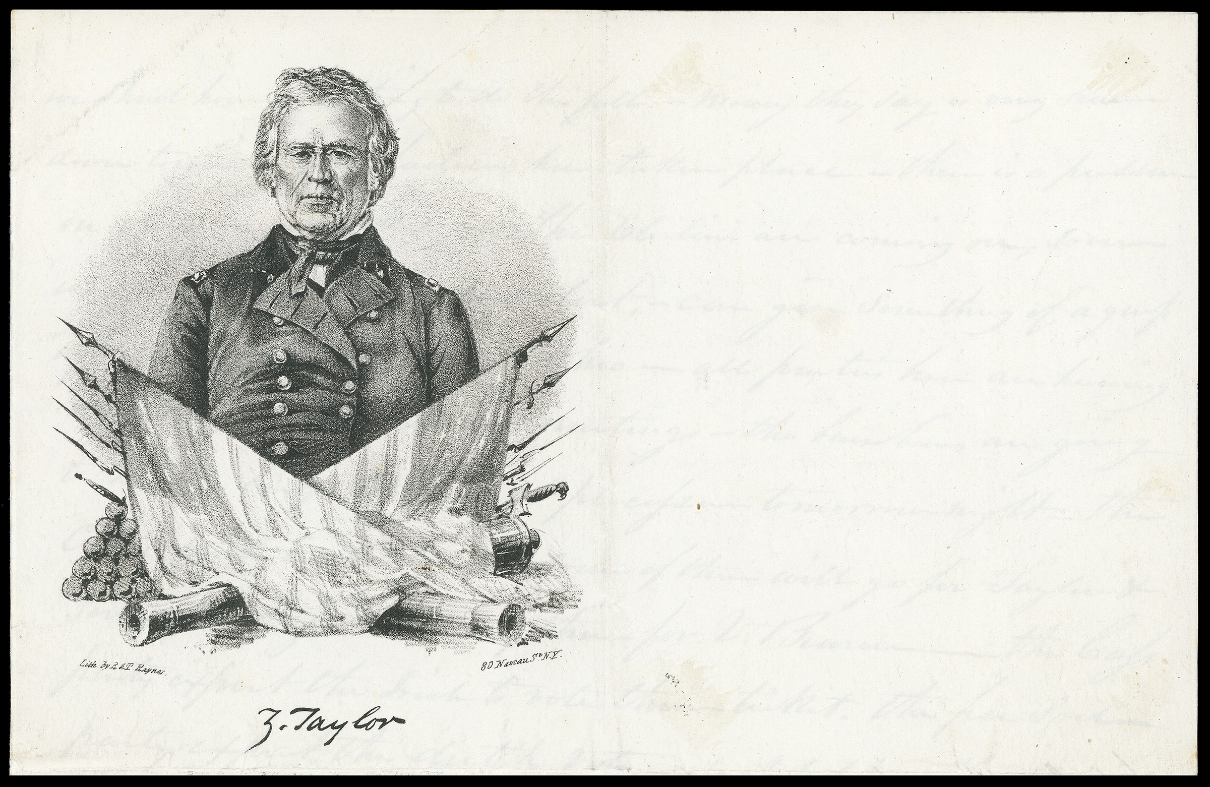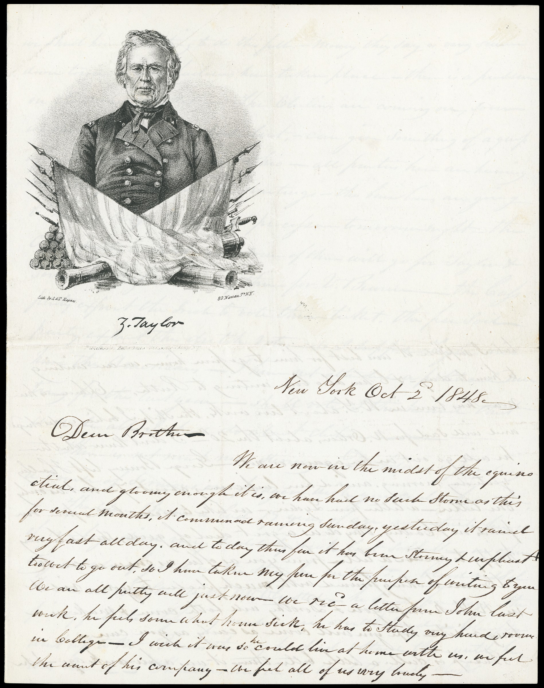 71     ZT-2 image(1848 Campaign) Zachary Taylor Lettersheet. Portrait campaign design in uniform with cannons, flag and printed signature below, on lettersheet datelined "New York Oct 2d 1848" with some good political content "…The elections are coming on, soon we shal known who is president - can give something of a guess after the election in Penn. & Ohio - all parties here are having very large & enthusiastic meetings…The Clay party is dissolved, some of them will go for Taylor & some for Cass & some of them for V. Buren. The Cass party expect the Irish to vote their ticket. The free soil party expect the dutch vote, so I suppose Taylor will have the Americans…", fresh and Very Fine, a wonderful campaign design.