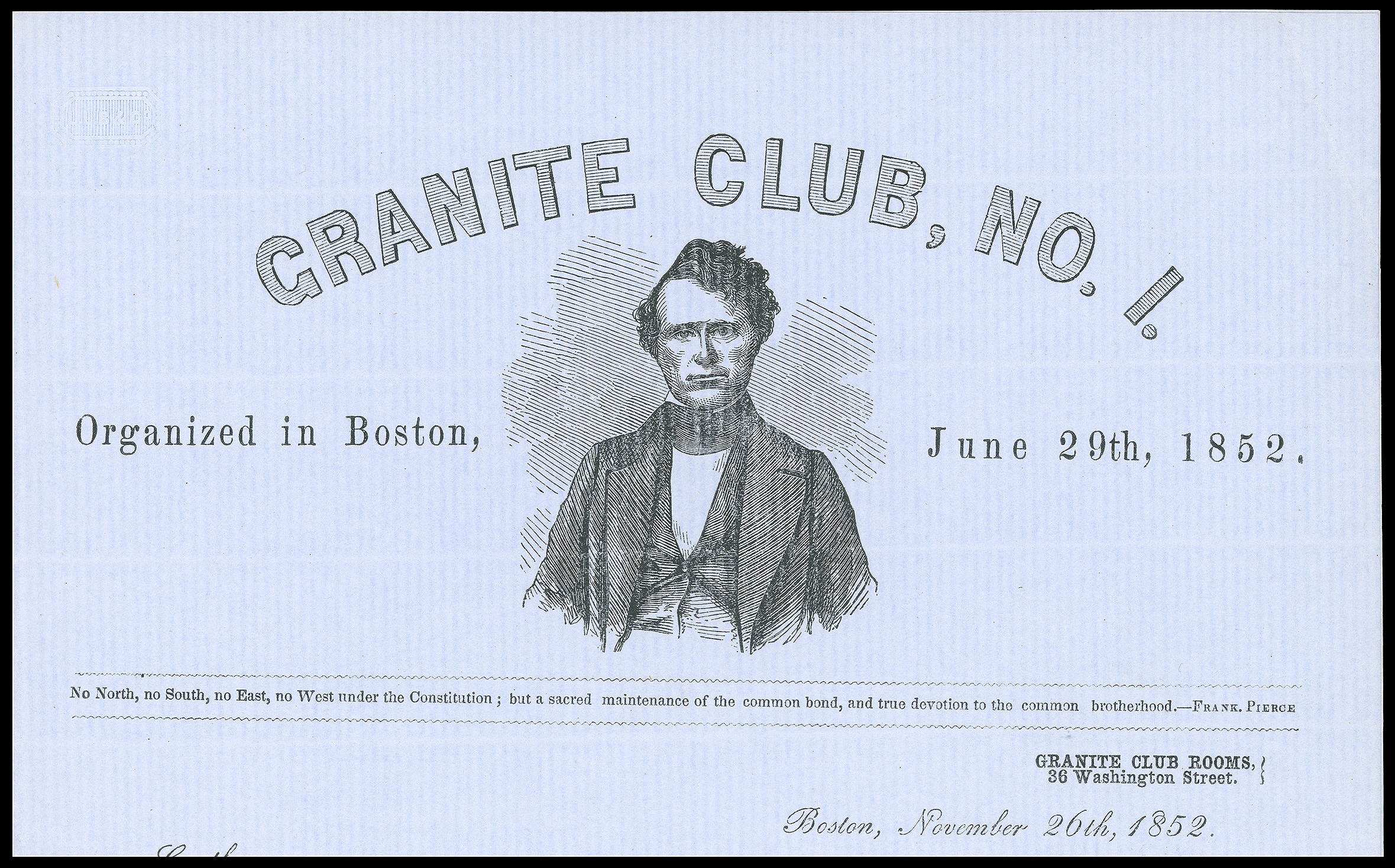 75     FP-1 image(1852 Campaign) Franklin Pierce Circular. Black portrait campaign design printed on blue circular with caption "No North, no South, no East, no West under the Constitution; but a sacred maintenance of the common bond, and true devotion to the common brotherhood.- Frank. Pierce", circular dated "Boston, November 26th 1852" concerning Granite Clubs, fresh and Very Fine.