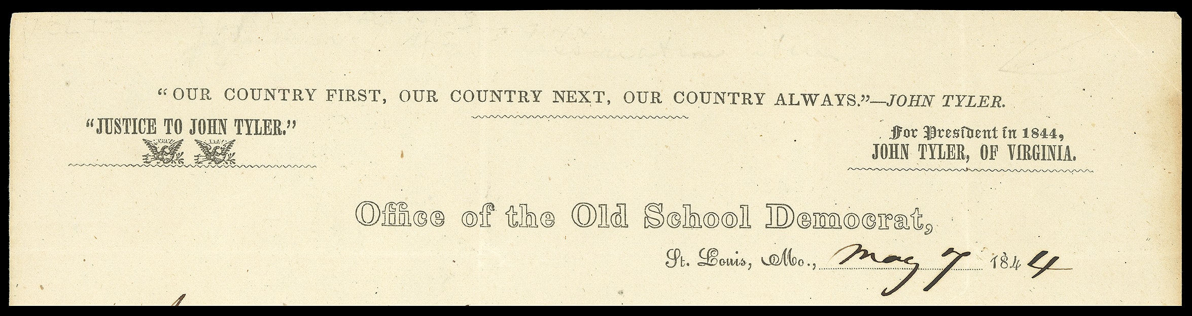 66     JT-1 image(1844 Campaign) John Tyler. Old School Democrat lettersheet with inscription that promotes John Tyler for President in 1844 and illustrated with two small eagles, Tyler verse "Our Country First, Our Country Next, our Country Always", datelined "St. Louis, Mo. May 7, 1844" with letter of recommendation concerning applicants for a Lieutenancy from V. Ellis, the Editor of the Old School Democrat, F.-V.F., the only recorded John Tyler campaign design recorded..