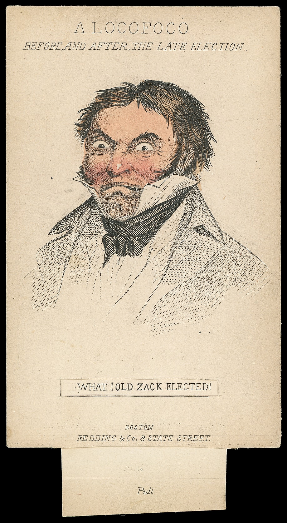 68       image(1848 Campaign) "A Locofoco". Early mechanical pull down multi-colored card showing two Faces: "What! Old Zack Elected!", other "Harra for Cass"; fragile but functional, Very Fine.