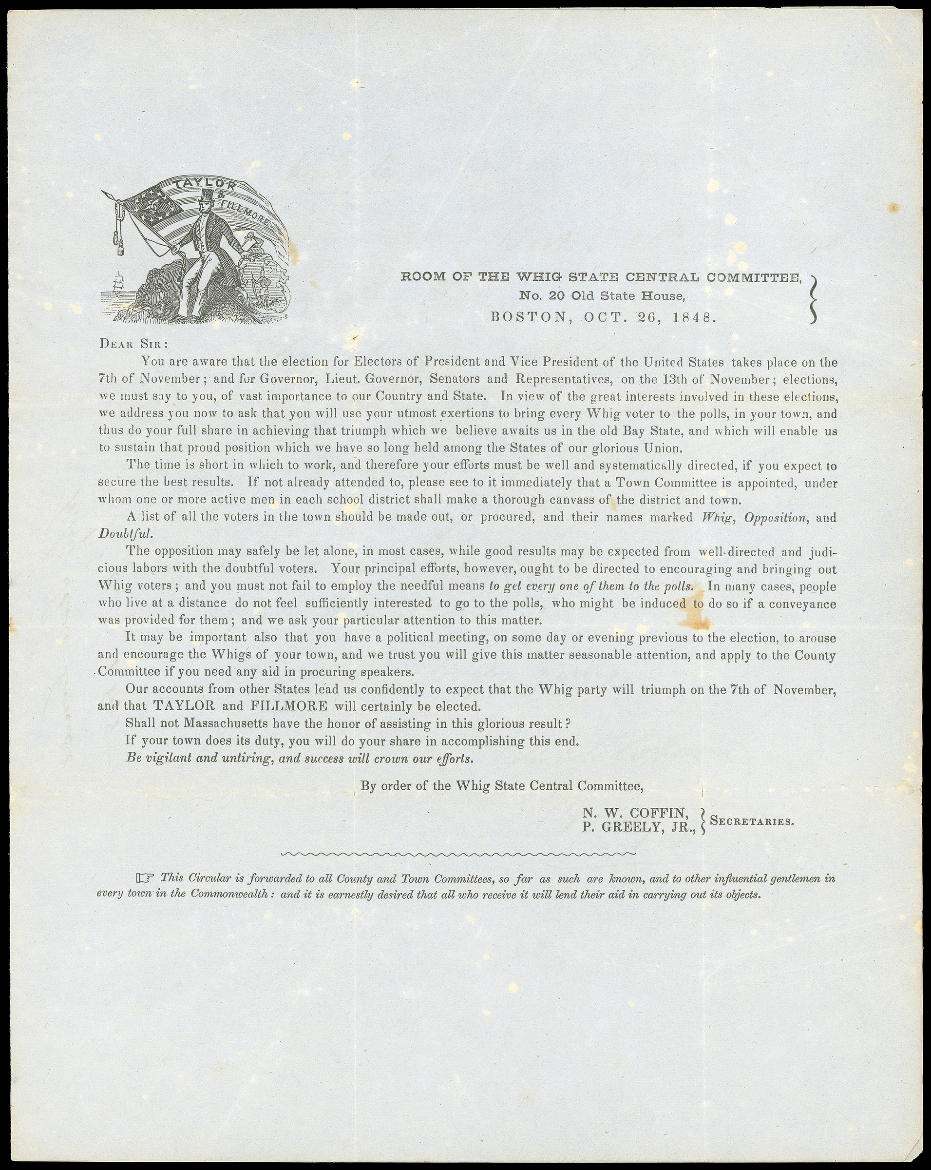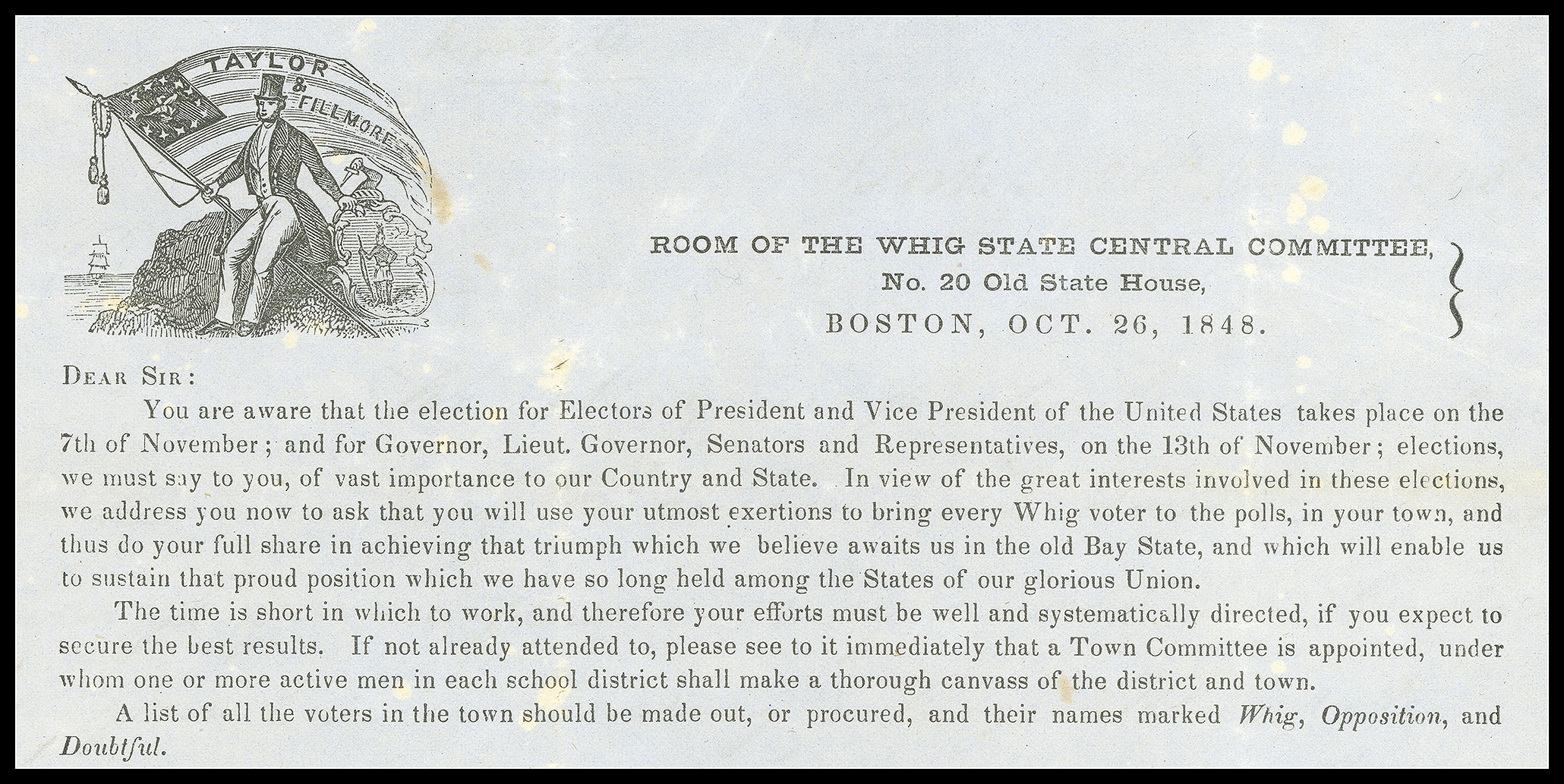 73     ZT-5 image(1848 Campaign) Zachary Taylor Lettersheet. Printed campaign design on blue lettersheet featuring Man and "Taylor & Fillmore" Flag, "Room of the Whig Party State Central Committee" letterhead and datelined "Boston, Oct 26 1848" announcing "the election for Electors of President and Vice President of the United States" and other political positions, imploring "…ask that you will use your utmost exertions to bring every Whig voter to the polls, in your town, and thus do your share in achieving that triumph which we believe awaits us in the old Bay State…"; file folds and light creasing, small tone spot, Very Fine and quite rare.