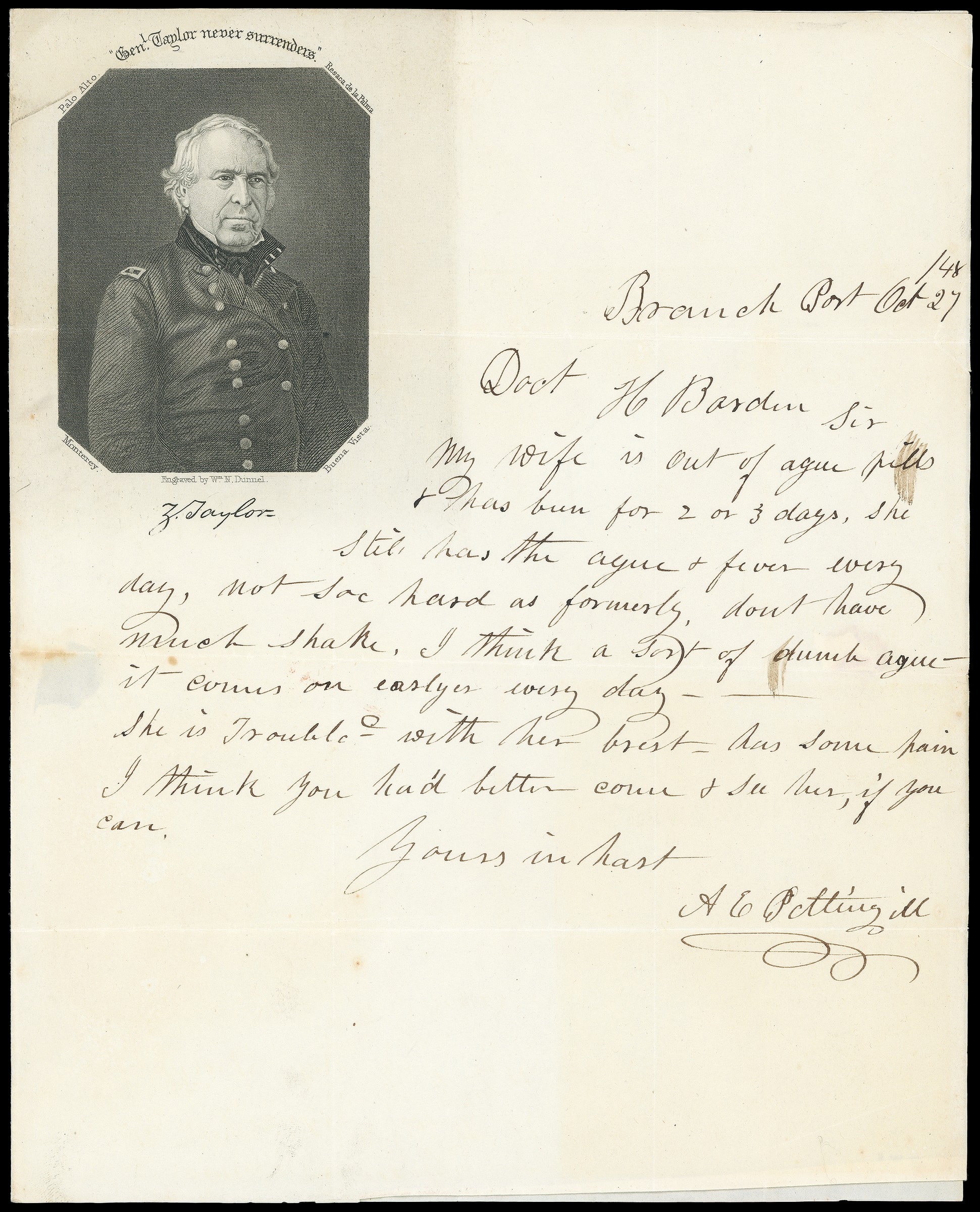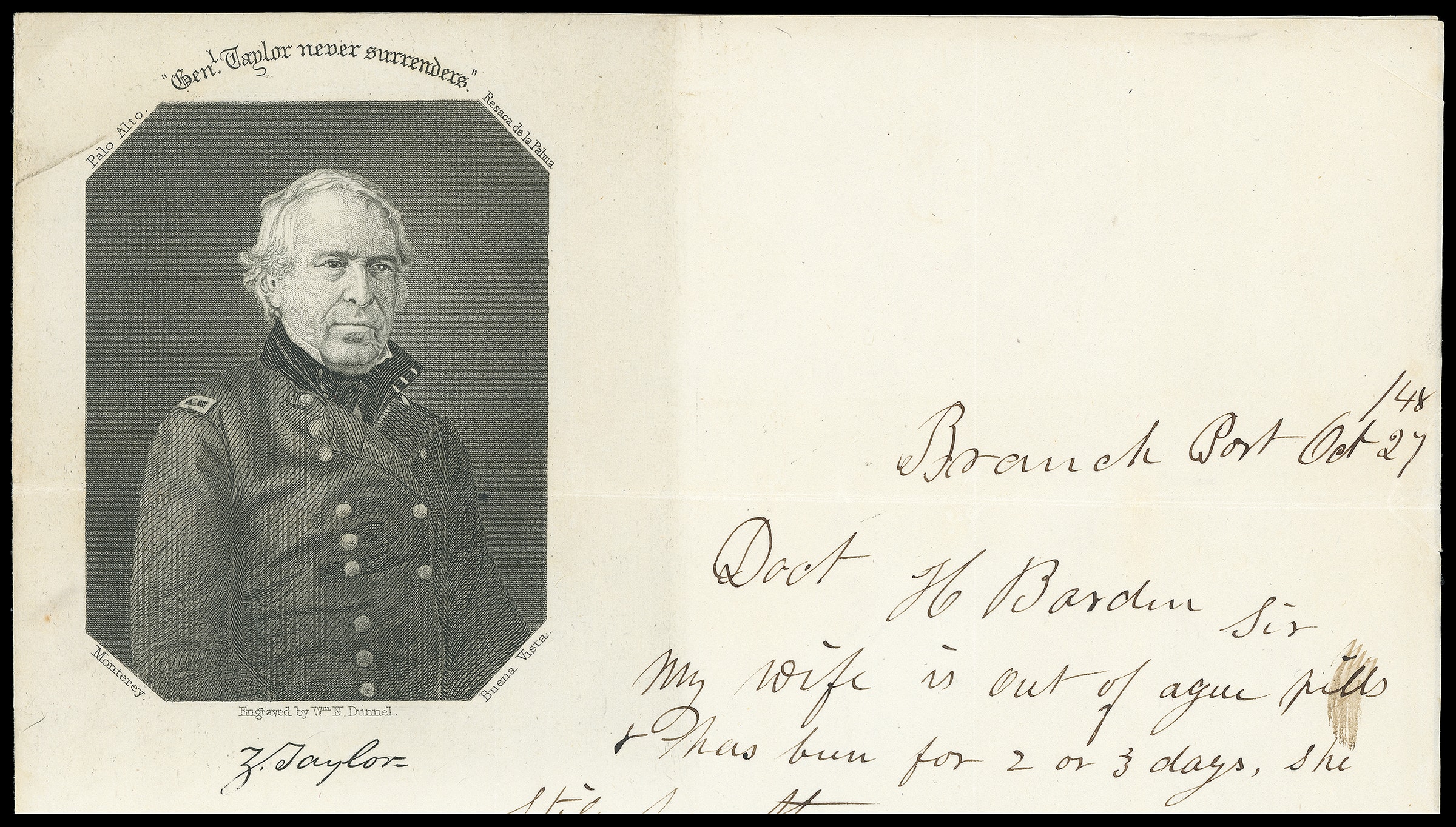 72     ZT-3 image(1848 Campaign) Zachary Taylor Lettersheet. Uniform portrait campaign design octagonal frame with printed autograph below, on lettersheet with "Genl. Taylor Never Surrenders" caption and list of his victories at corners, datelined "Branch Port Oct 27/47", entered mails with manuscript "Pomfret N.Y. 26 Oct" postmark and ms. "Paid 5" rating to Penn Yan N.Y., Very Fine.