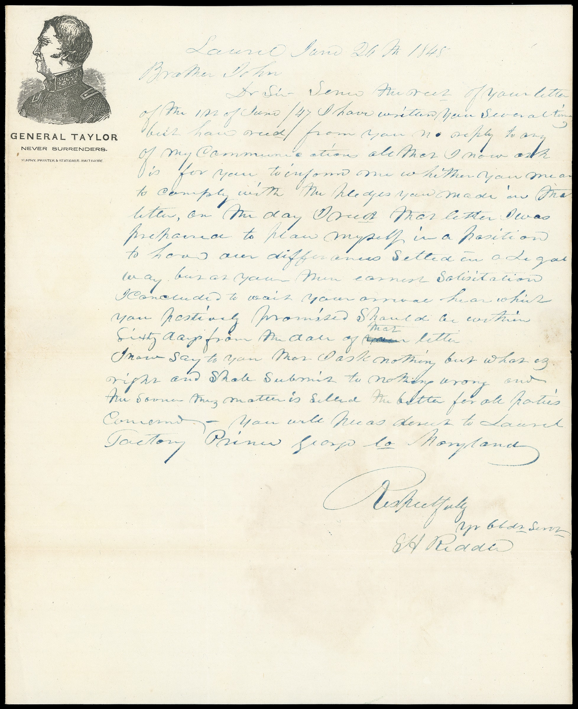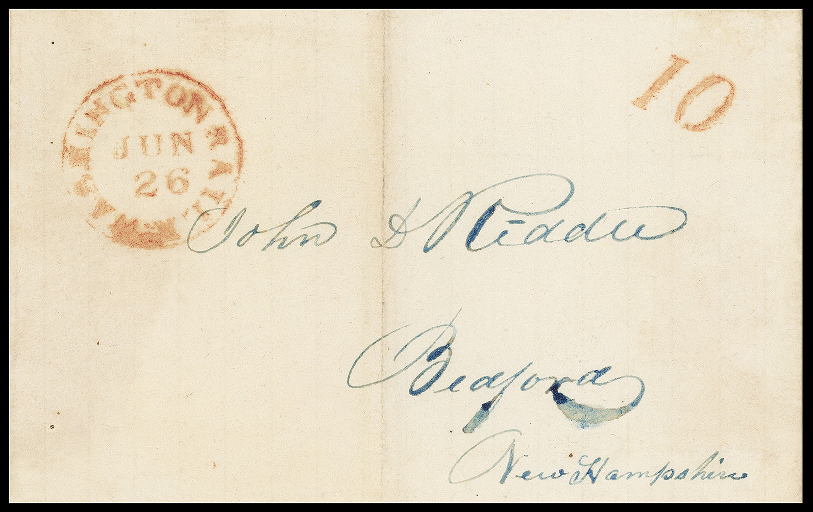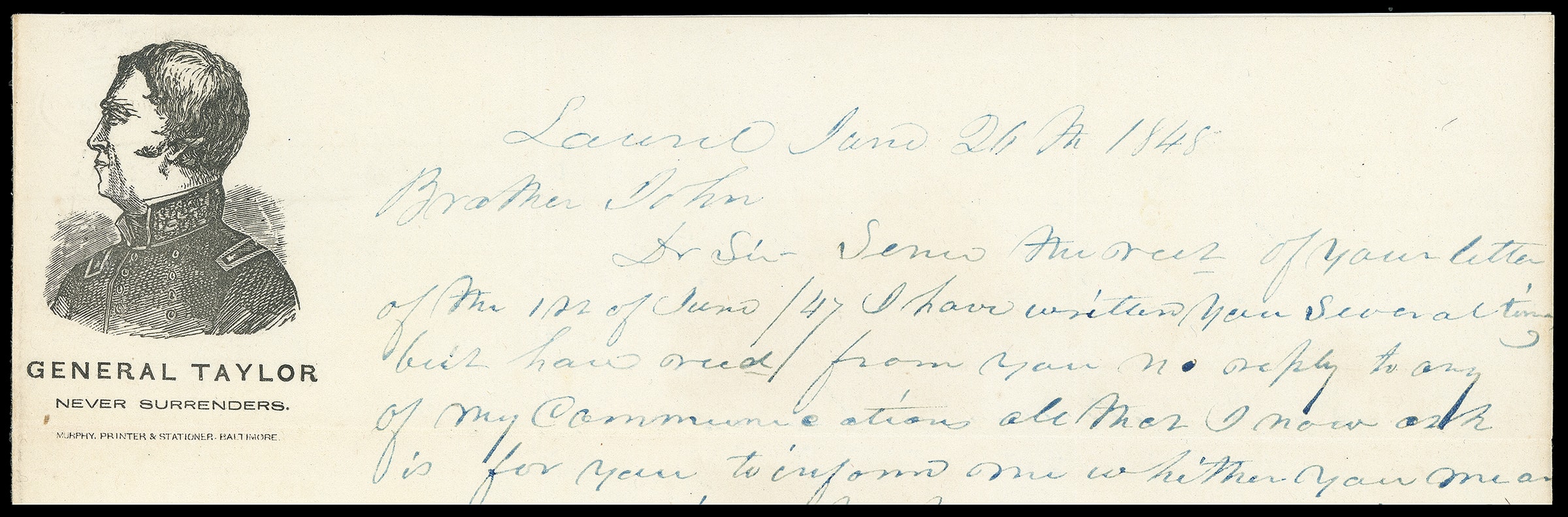 74     ZT-unlisted image(1848 Campaign) Zachary Taylor Lettersheet. Portrait campaign design with "General Taylor Never Surrenders" caption, "Murphy, Printer & Stationer, Baltimore" imprint on lettersheet datelined "Laurel, June 20th 1848", entered mails with red "Washington Rail Road, Jun 26" cds and matching "10" rating handstamp to Bedford N.H., Very Fine and scarce railroad campaign use.