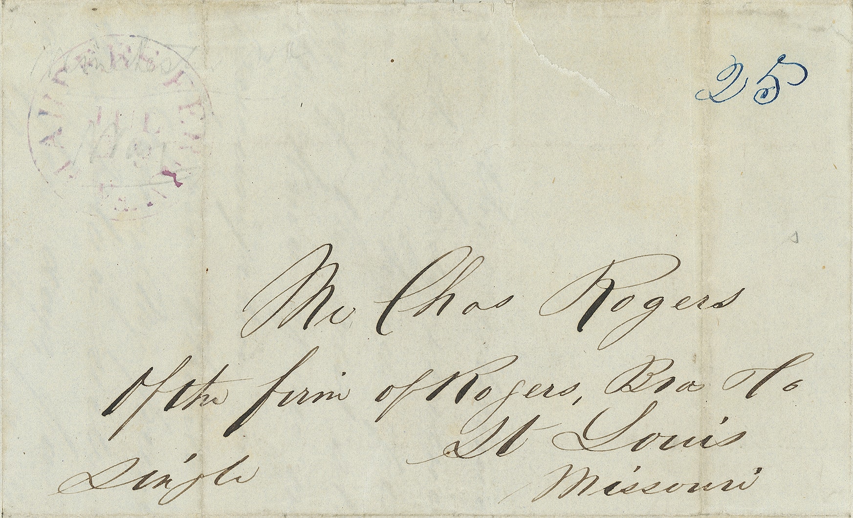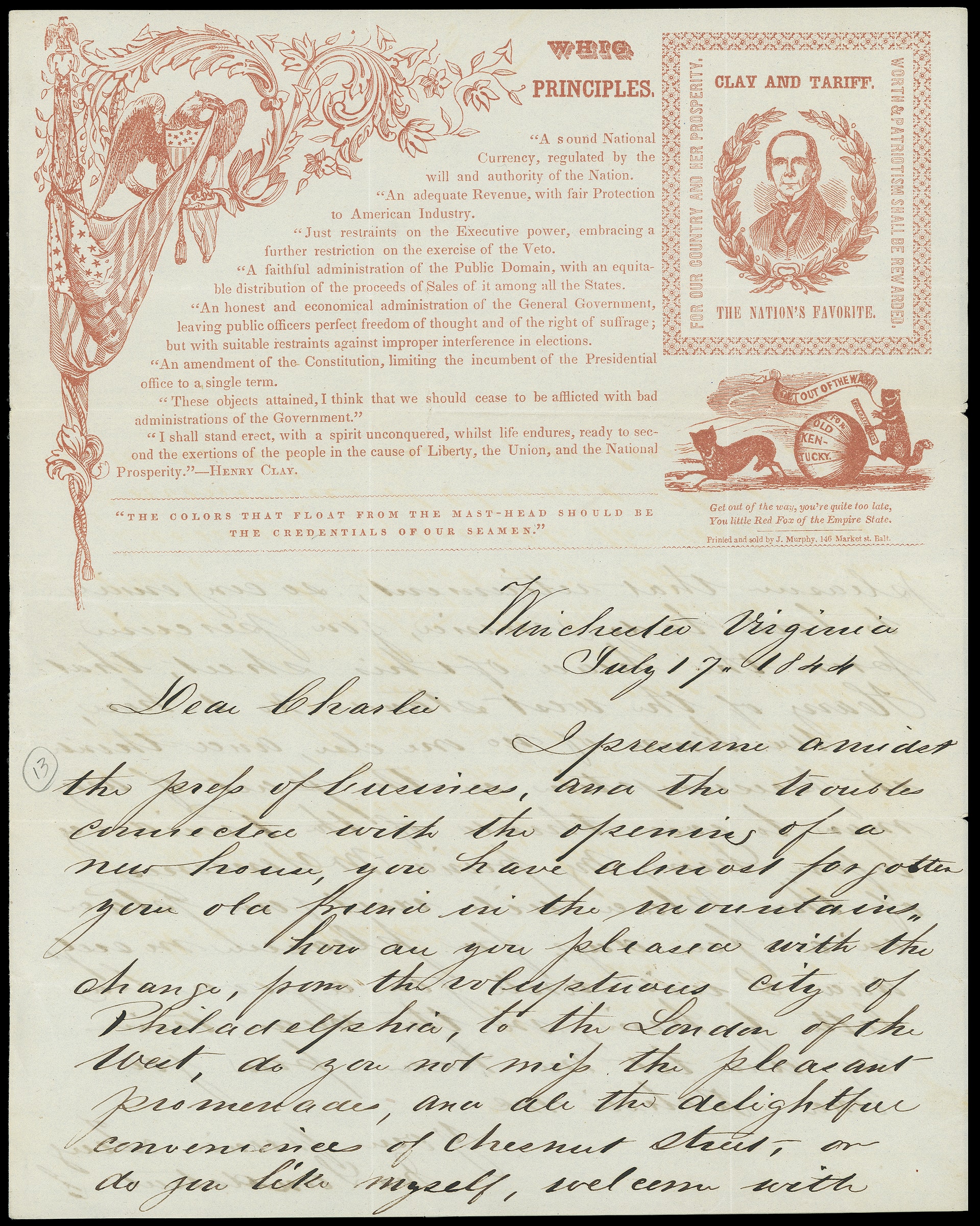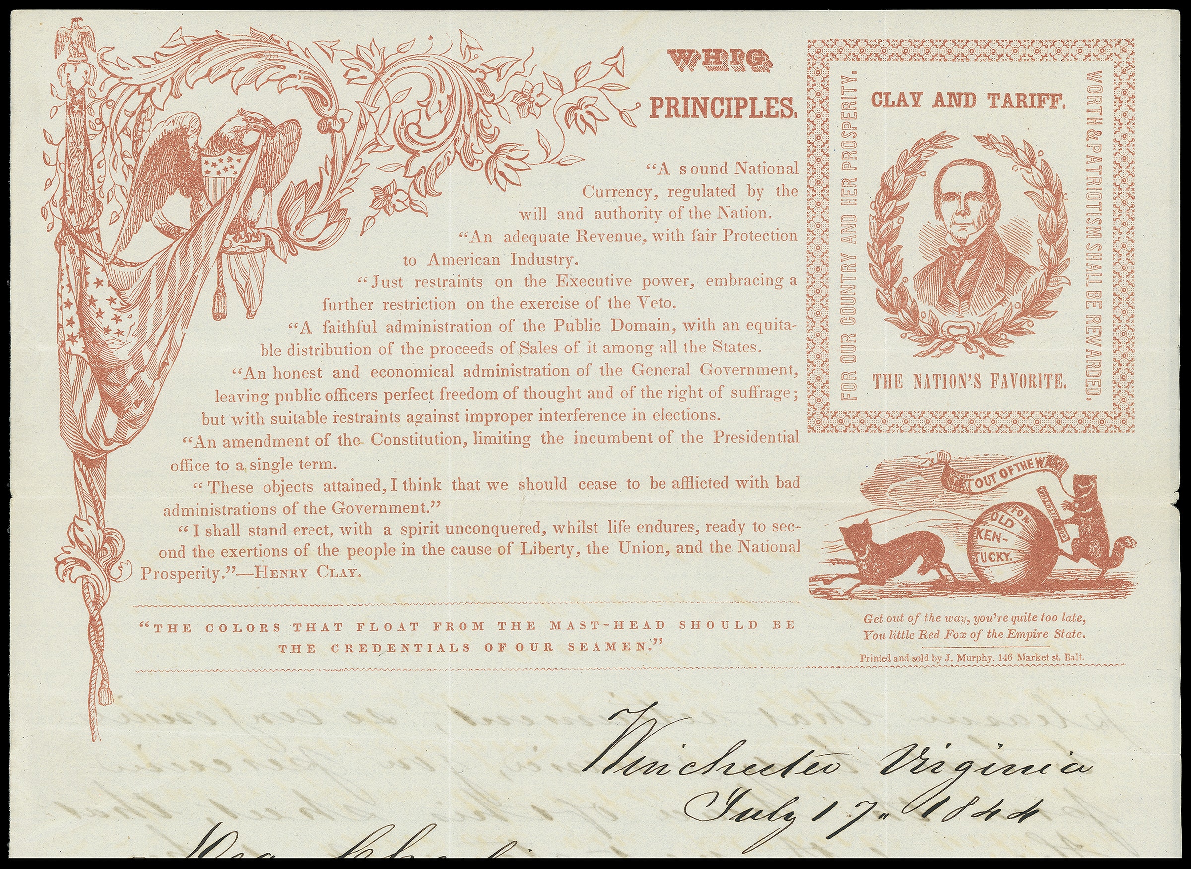 62     HC-12 image(1844 Campaign) Henry Clay Lettersheet. Elaborate orange campaign design featuring "Whig Principles", Clay in oval portrait in ornate square picture frame with "Clay and Tariff" and "The Nations Favorite", additional Fox, Racoon and Ball caricature below, "J. Murphy" imprint, gray lettersheet datelined "Winchester Virginia July 17 1844" with some political content "…Harry of the west stands No 1 here, We know of no one else, and think it presumptive on the part of any many to ever think of the Presidency before him…", entered mails with magenta "Winchester Va. Jul 19" cds and ms. "25" rating to St. Louis Mo.; file folds, minor tear in address sheet, Very Fine and rare, a remarkable campaign design.