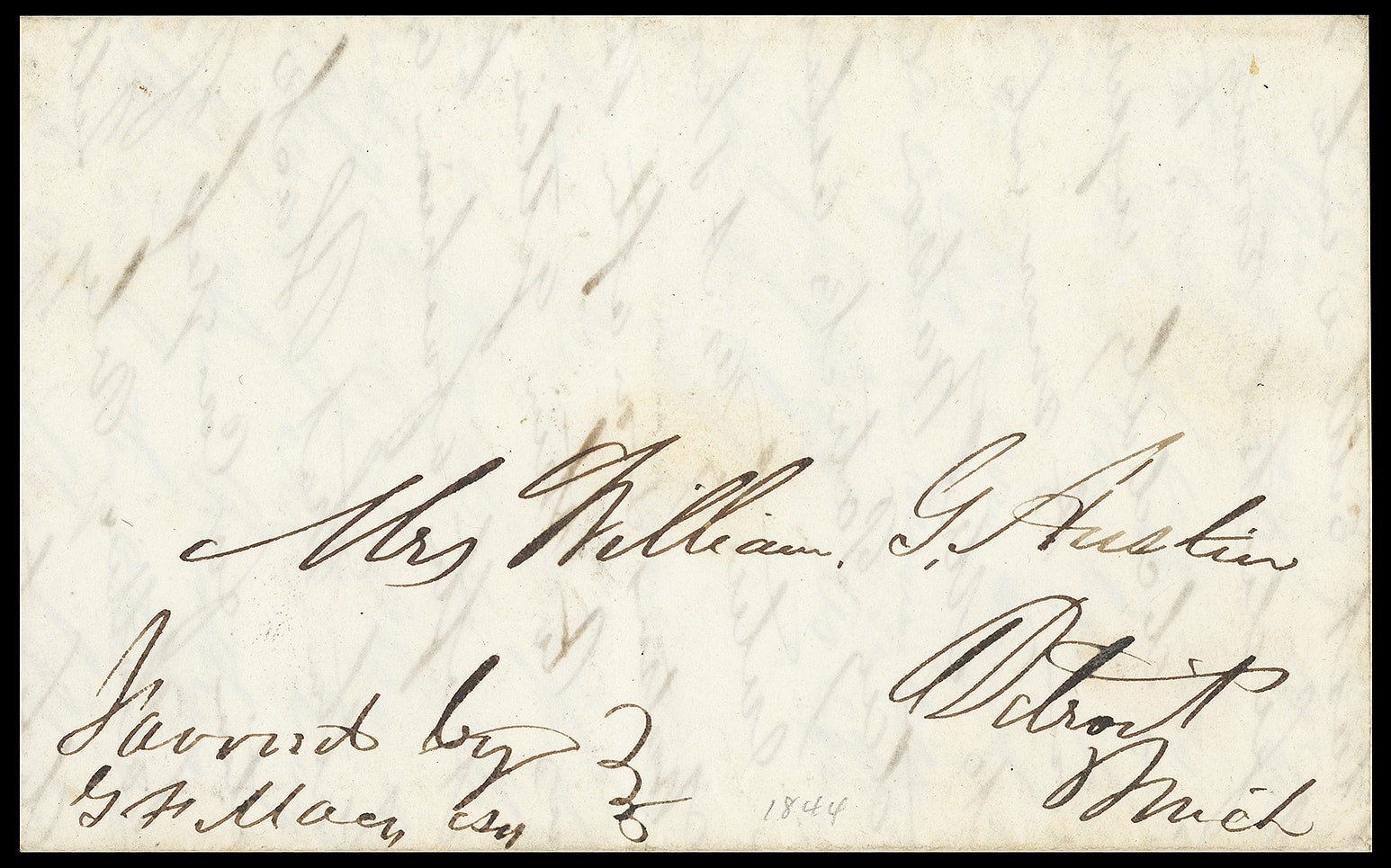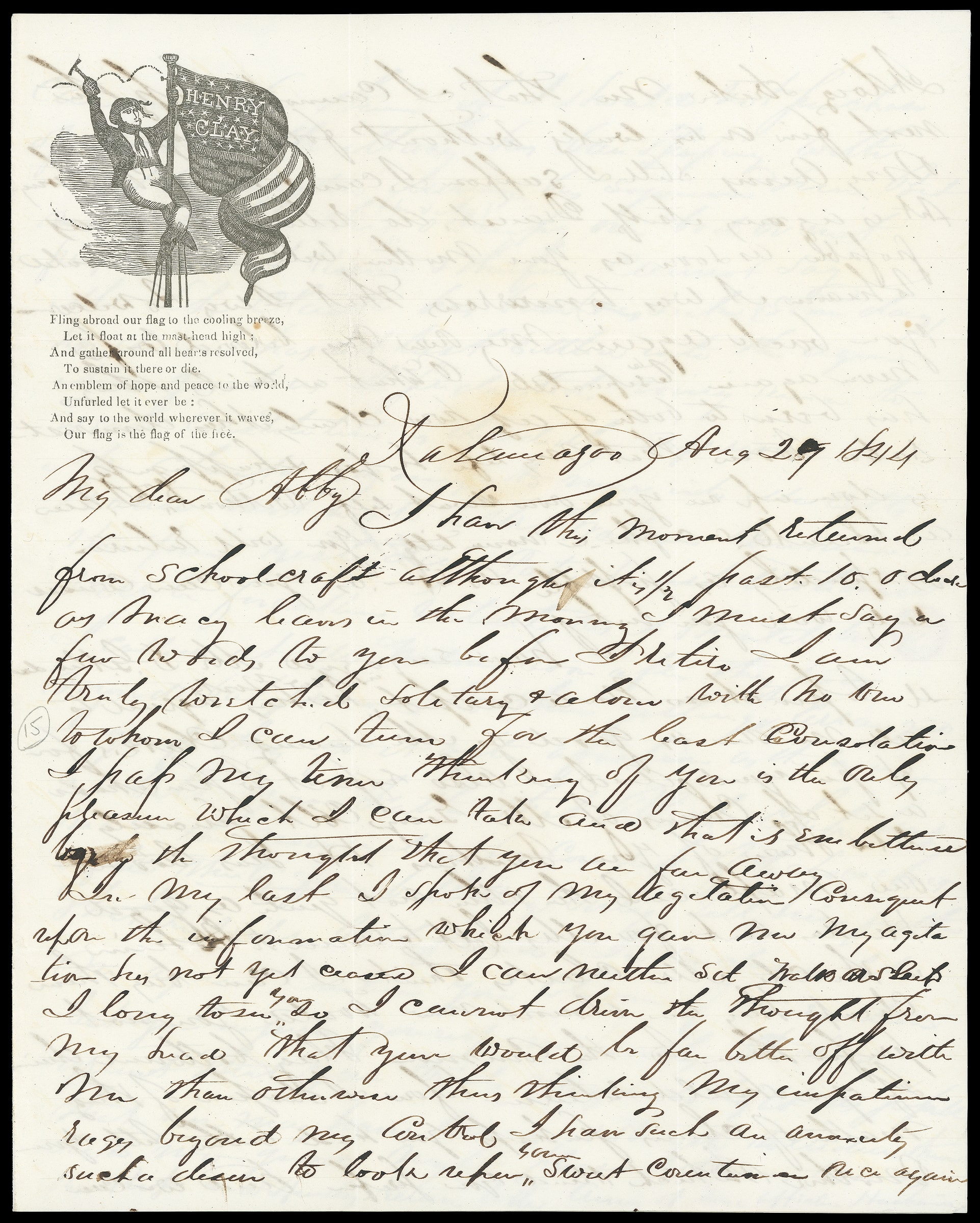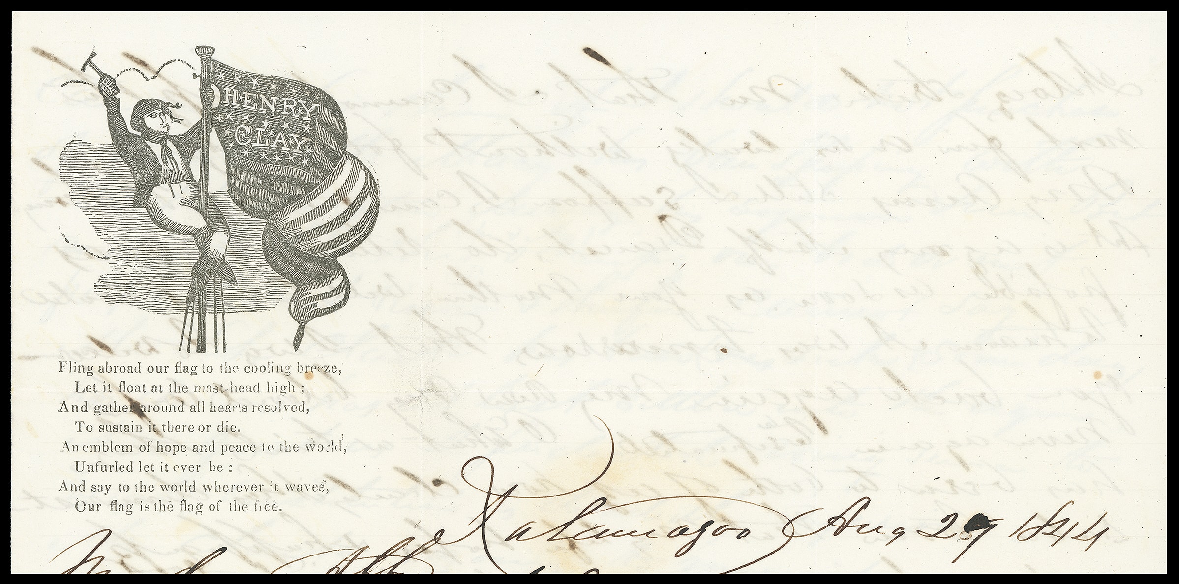 63     HC-13 image(1844 Campaign) Henry Clay Lettersheet. Campaign design featuring "Henry Clay" Flag on gray lettersheet datelined "Kalamazoo (Mich) Aug 29, 1844" with lengthy three-page letter from husband back home to his wife, hand carried to "Detroit, Mich" endorsed "favored by G.F. Macy", Very Fine.